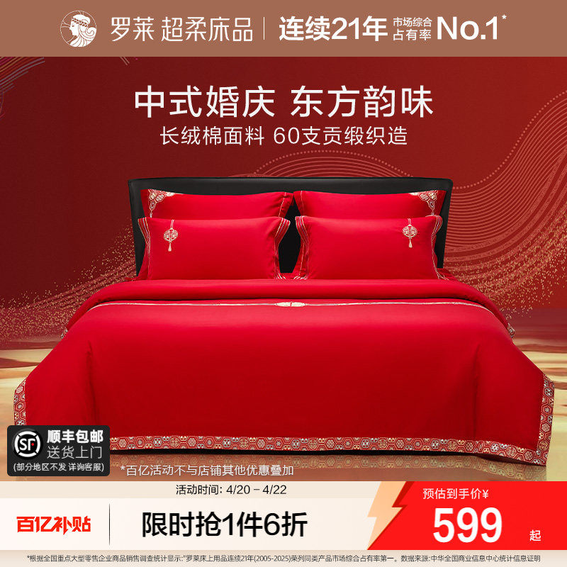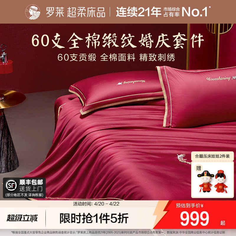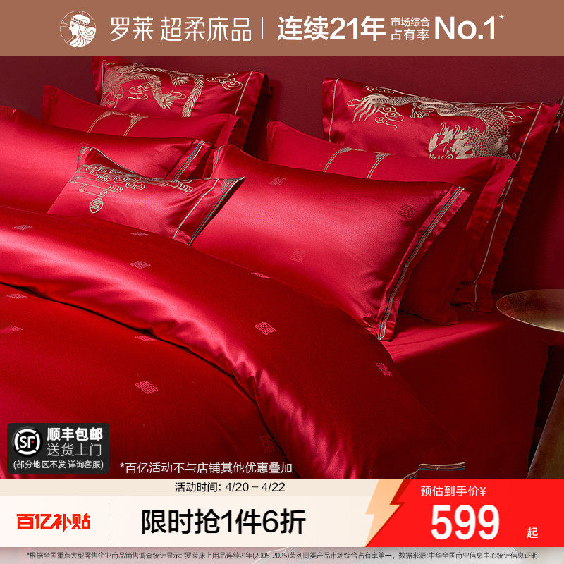 罗莱家纺结婚四件套全棉喜庆婚庆婚床上用品大红色囍嫁婚庆六件套