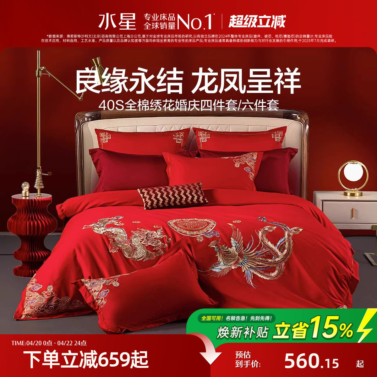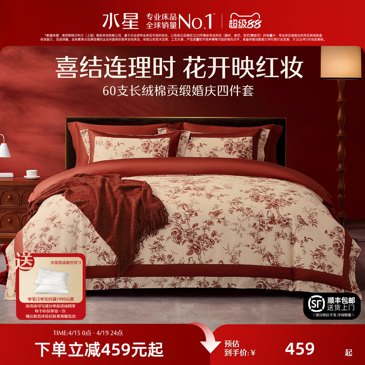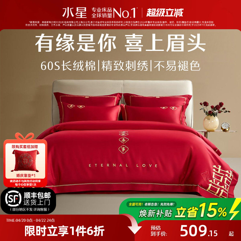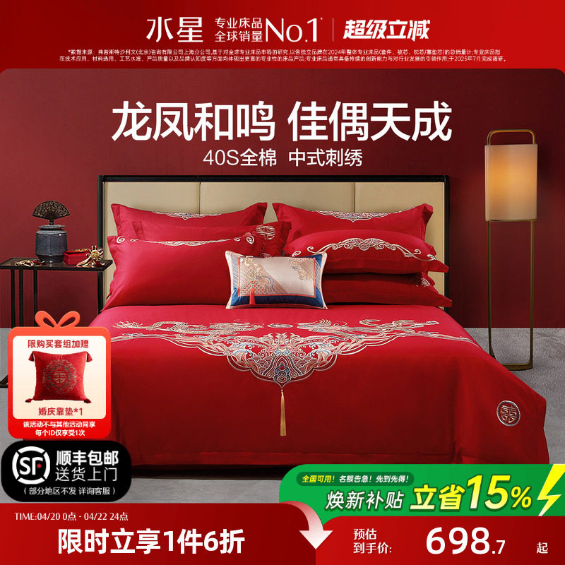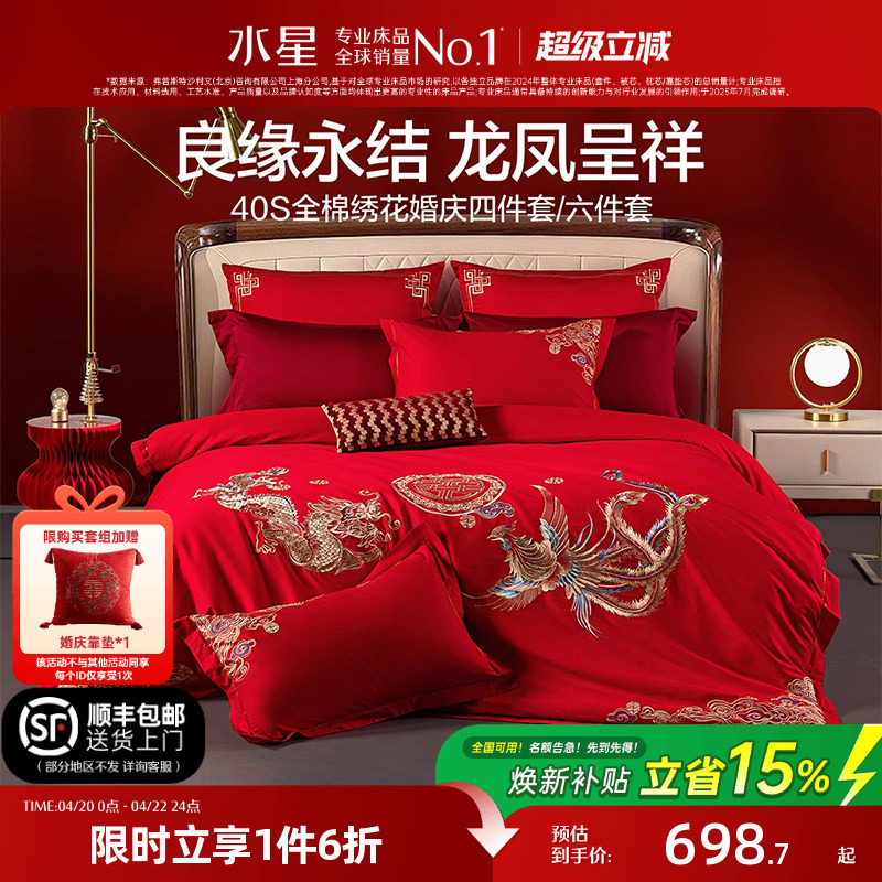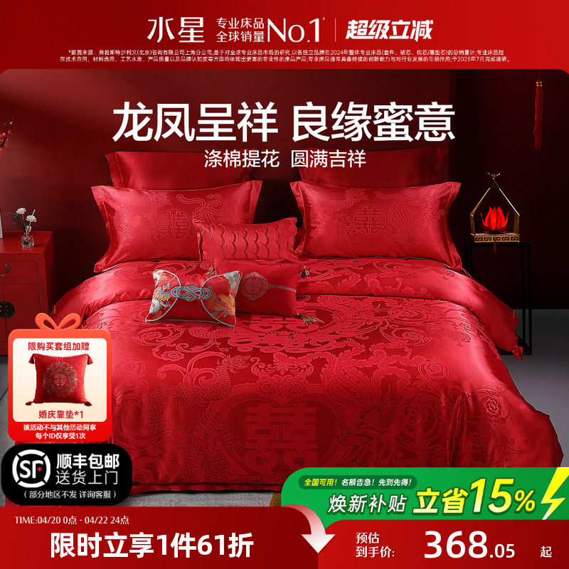 水星家纺全棉婚庆四件套60支长绒棉喜庆红色结婚新中式婚嫁床品