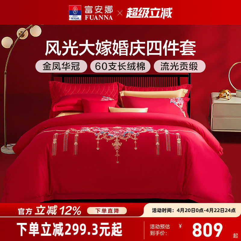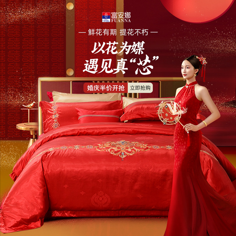 富安娜结婚四件套婚庆红色纯棉床上用品新婚礼物婚嫁喜被新婚被套