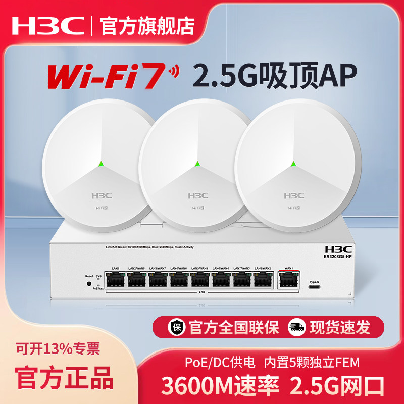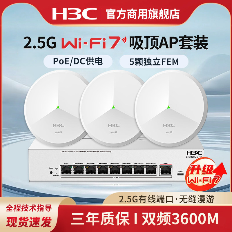 H3C新华三 WiFi7 2.5G无线吸顶ap双频3600M企业级全屋wifi路由器大户型酒店别墅BE3600CQ全2.5G口ER3208G5-HP