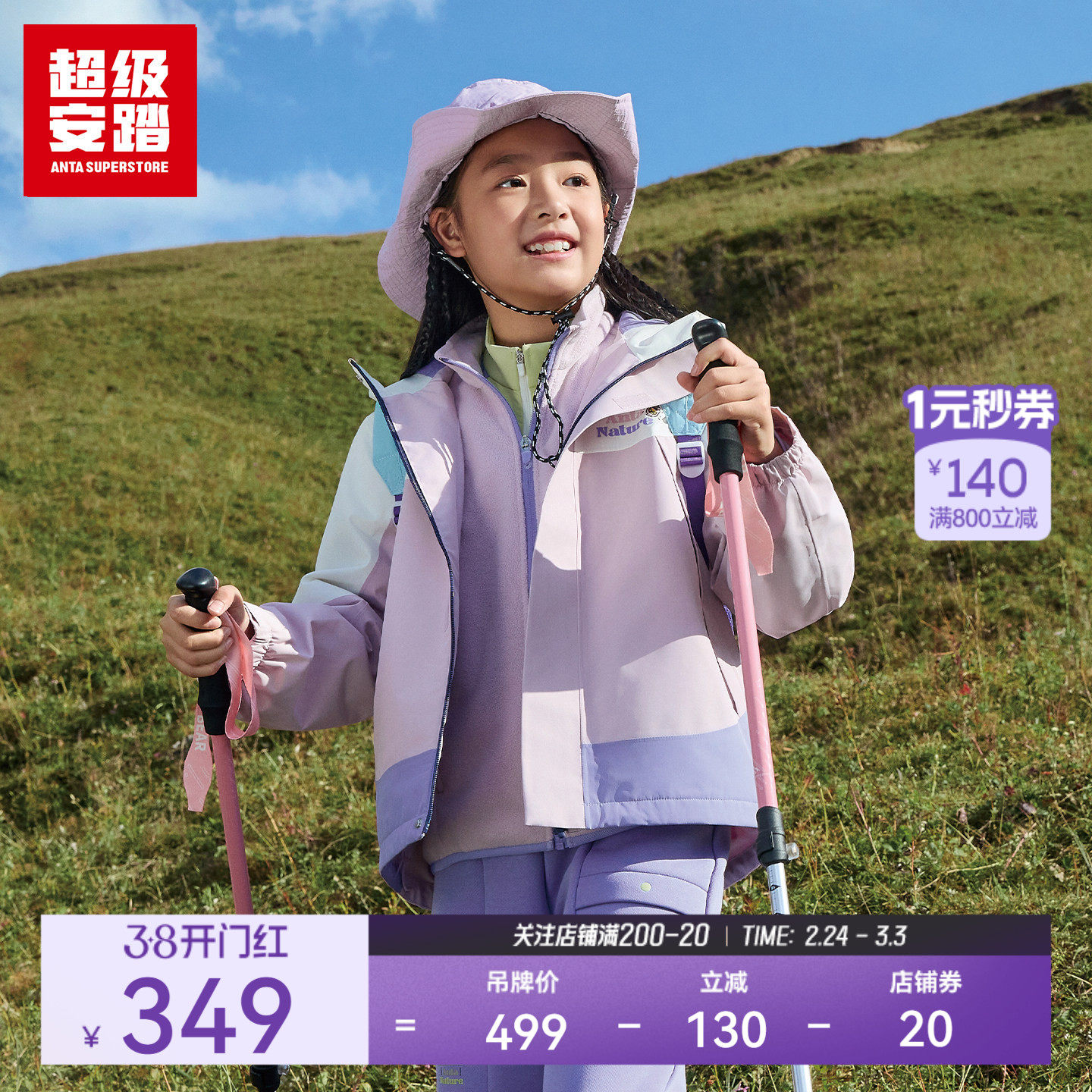 超级安踏儿童冲锋衣两件套春季女保暖连帽外套抓绒内胆362616609U