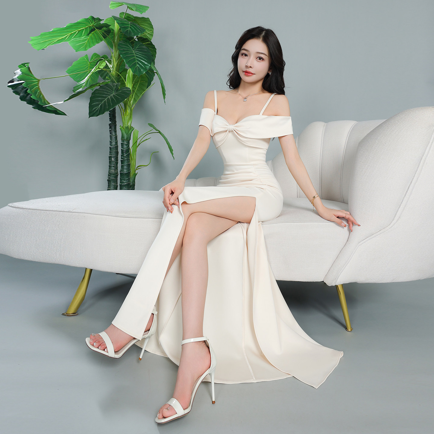 性感露肩吊带晚礼服女开叉包臀长裙名媛气质显瘦轻奢蝴蝶结连衣裙
