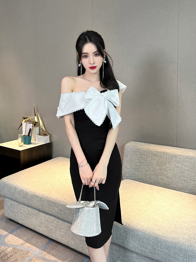 性感一字领蝴蝶结露肩礼服裙子女夏季新款气质修身显瘦包臀连衣裙