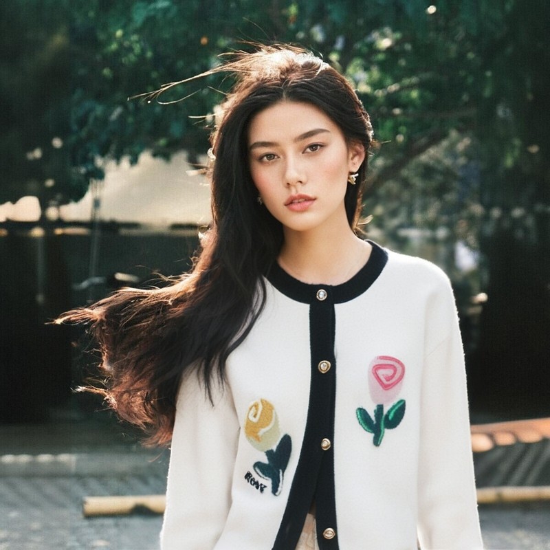韩系2025早秋新款圆领长袖花朵刺绣毛衣针织开衫上衣女慵懒风百搭