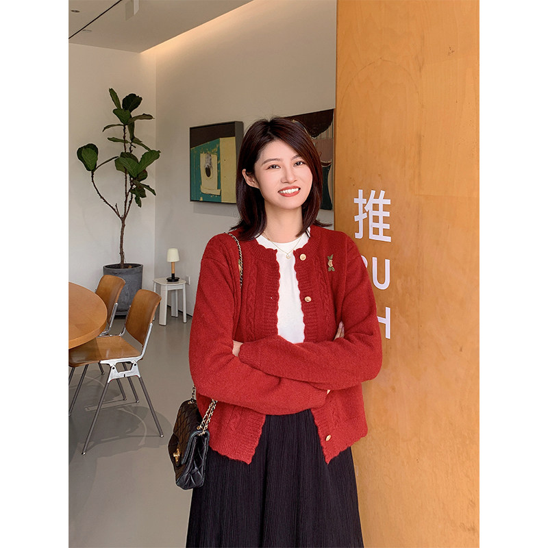 红色花朵刺绣毛衣外套女2025秋冬新款大码女装微胖mm慵懒针织开衫