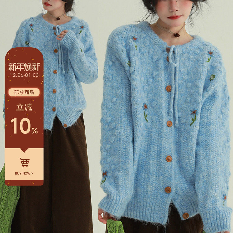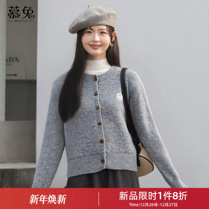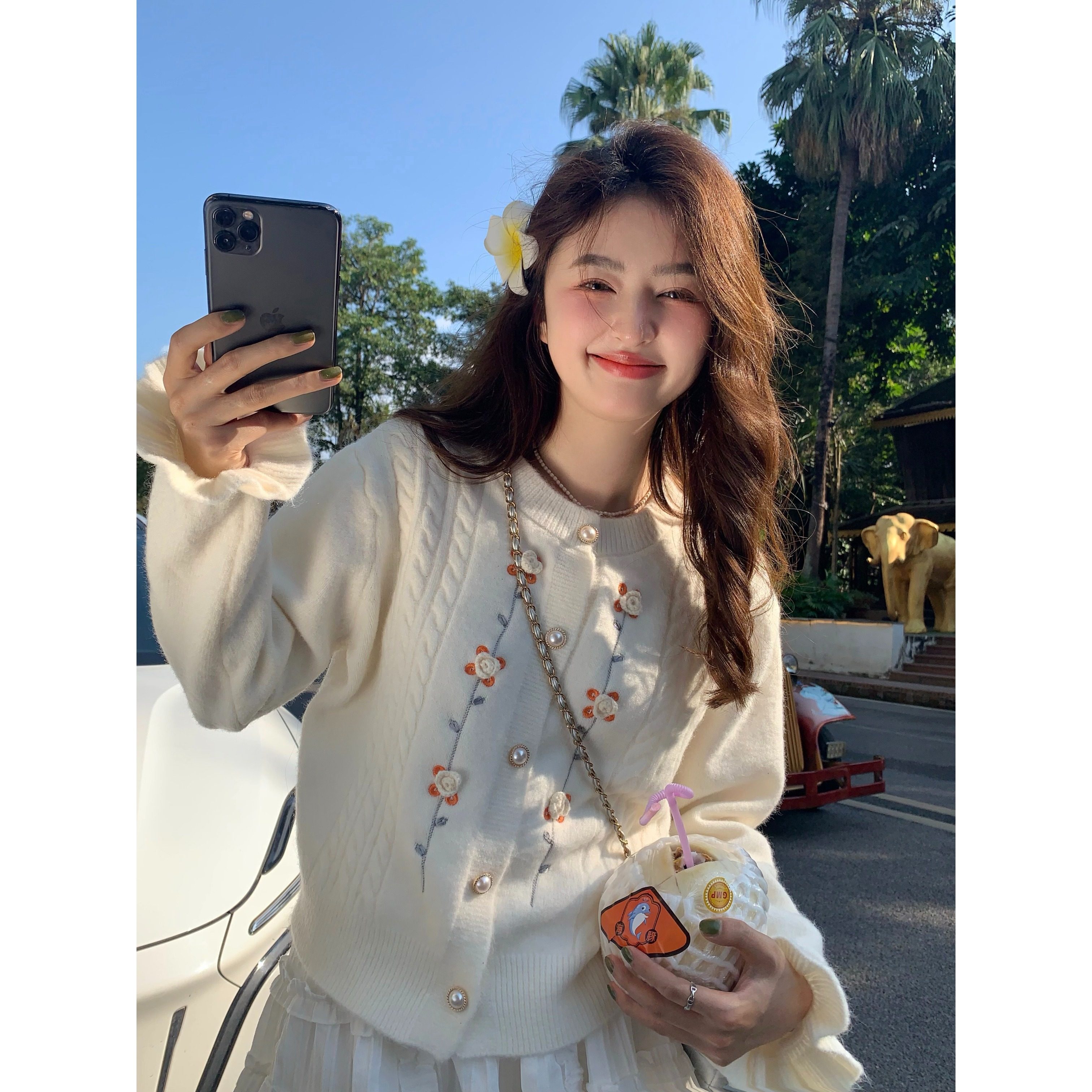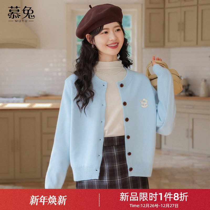 慕兔甜美温柔风花朵刺绣毛衣开衫女2025冬季新款圆领宽松针织上衣