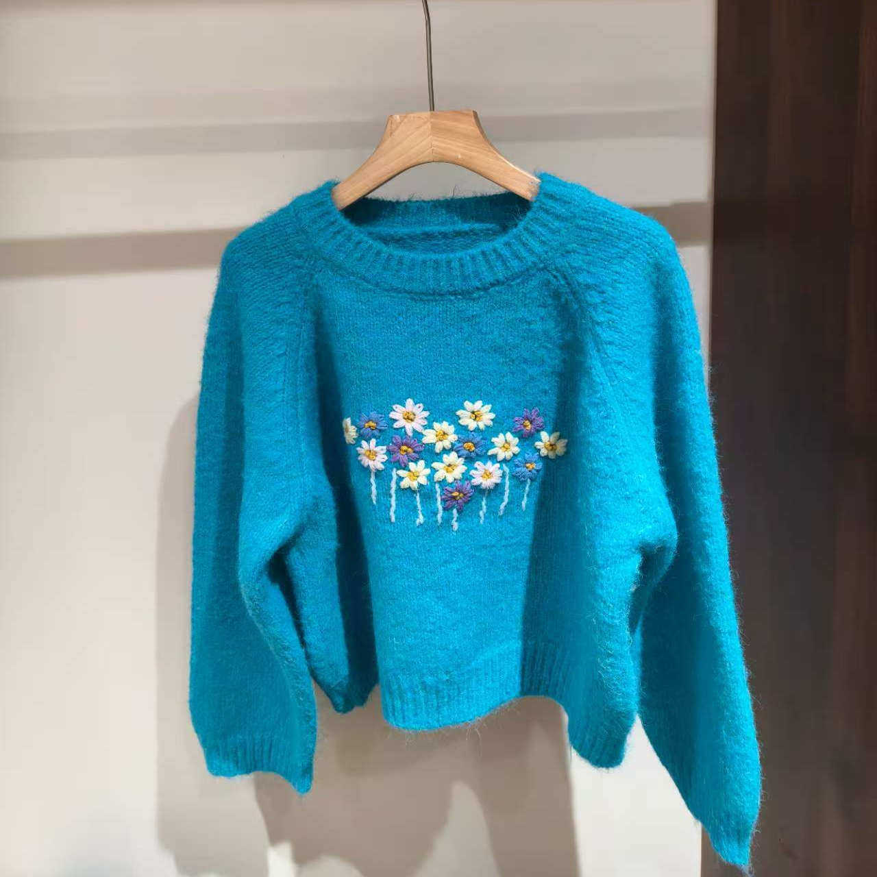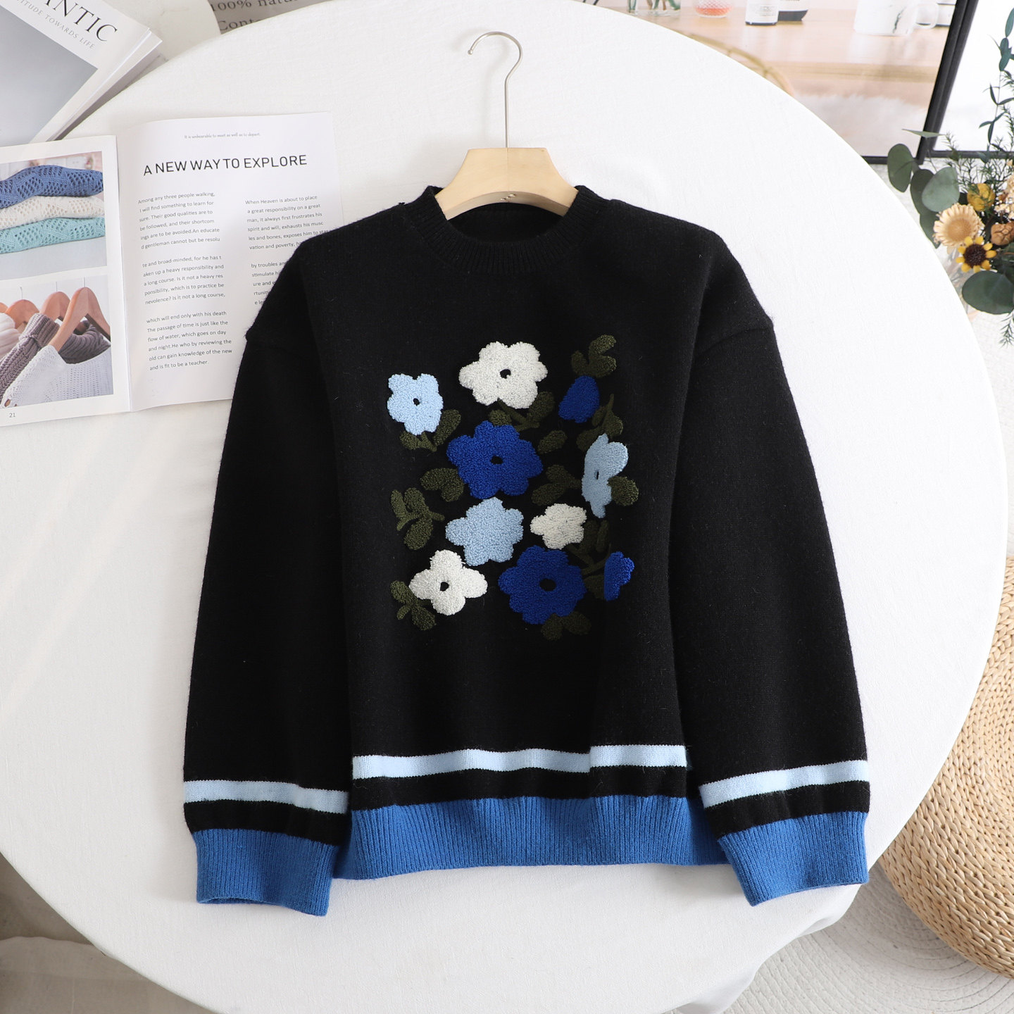 甜美可爱风圆领花朵刺绣毛衣女冬季新款套头宽松百搭柔软针织衫潮