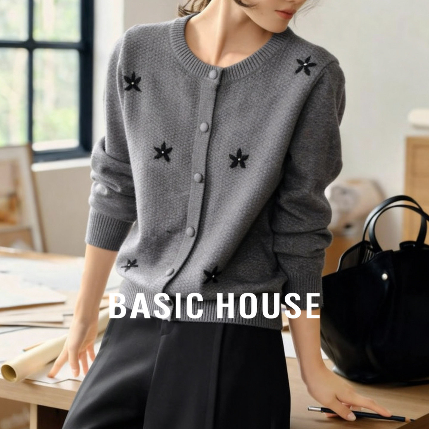 Basic House/百家好韩系花朵刺绣毛衣女冬季落肩圆领宽松开衫外套