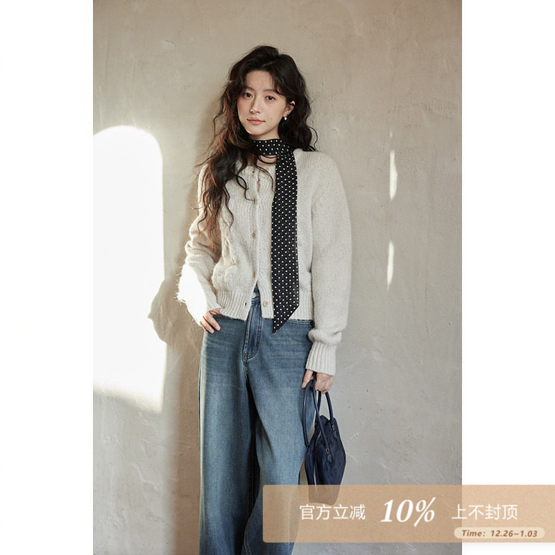 夕蒙2025新款冬季韩系气质针织衫短款立体花朵刺绣米色毛衣开衫女