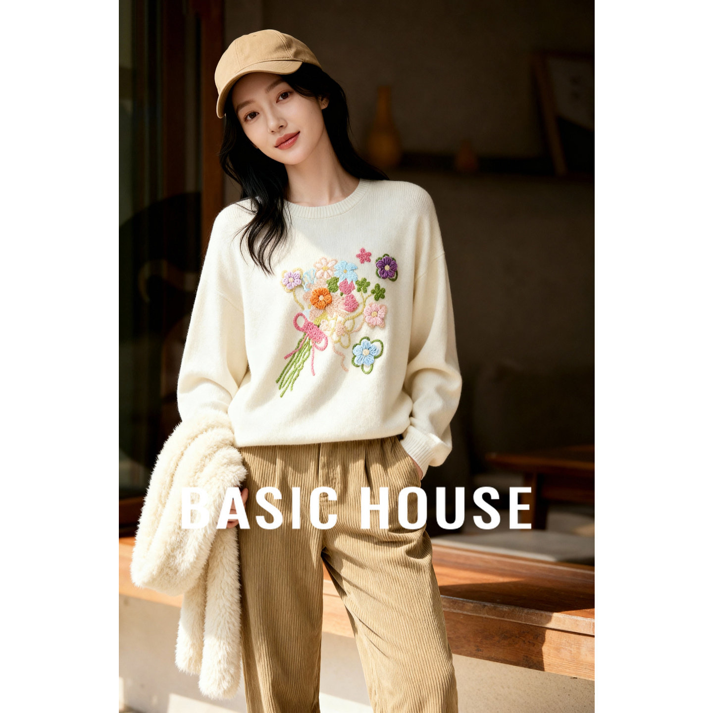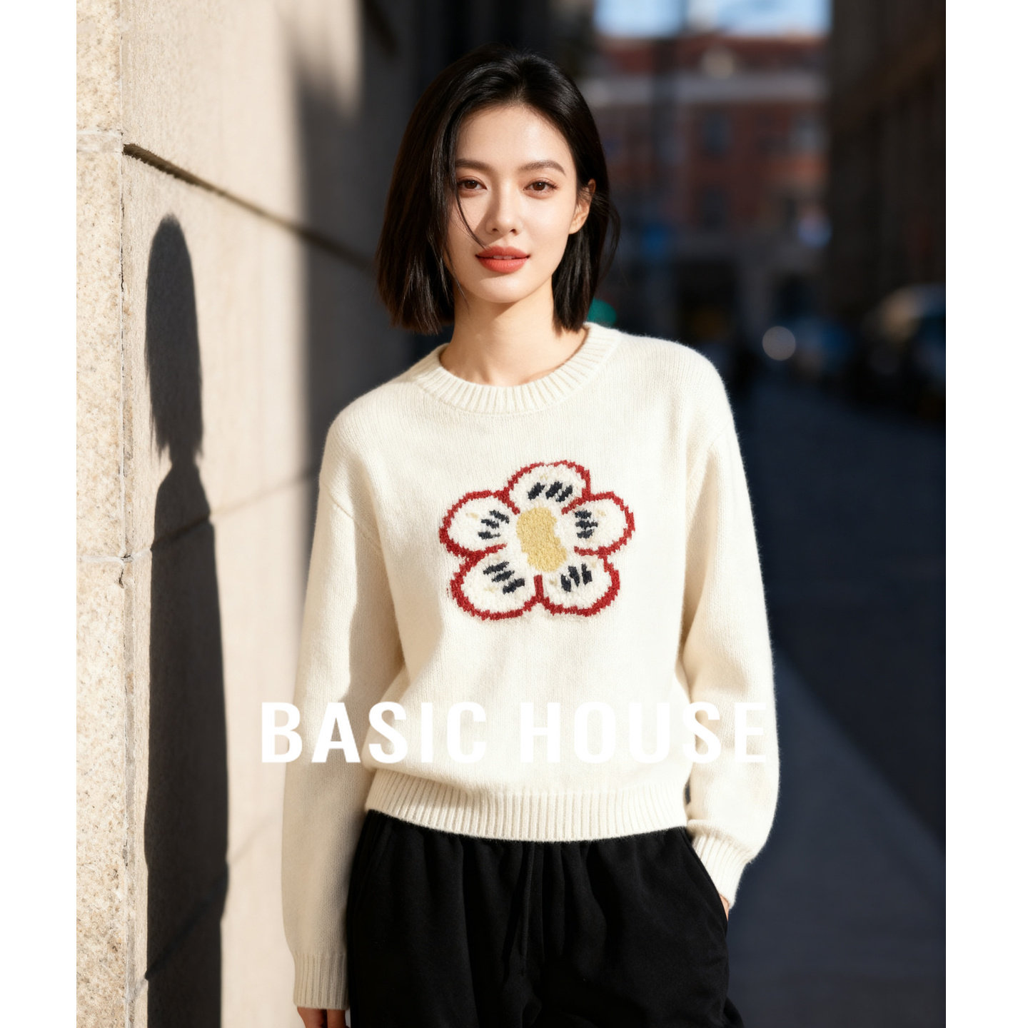 Basic House/百家好花朵刺绣毛衣慵懒风女25秋冬新款圆领软糯上衣