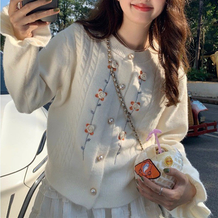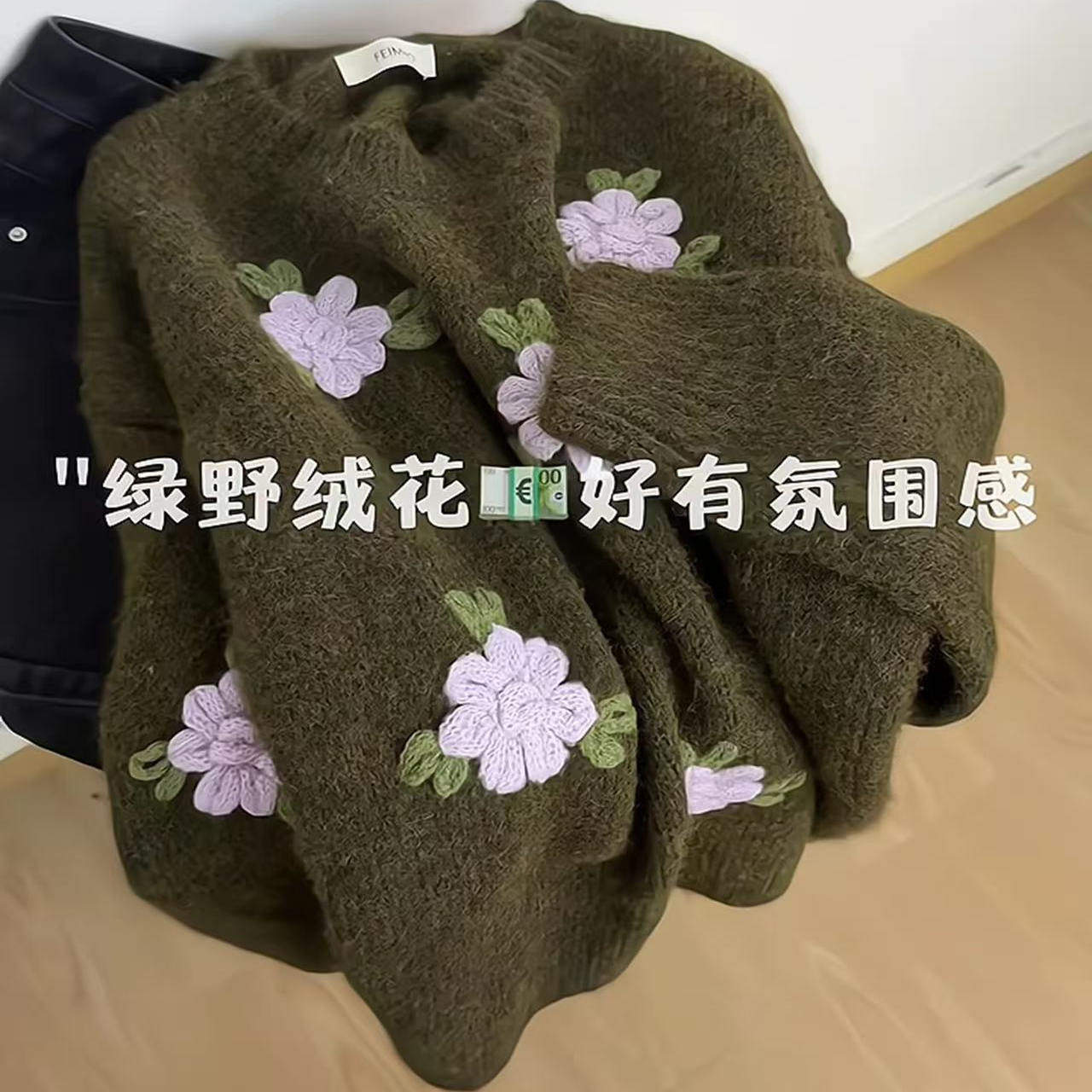 温柔慵懒风花朵刺绣毛衣外套女秋冬新款宽松百搭气质V领针织上衣
