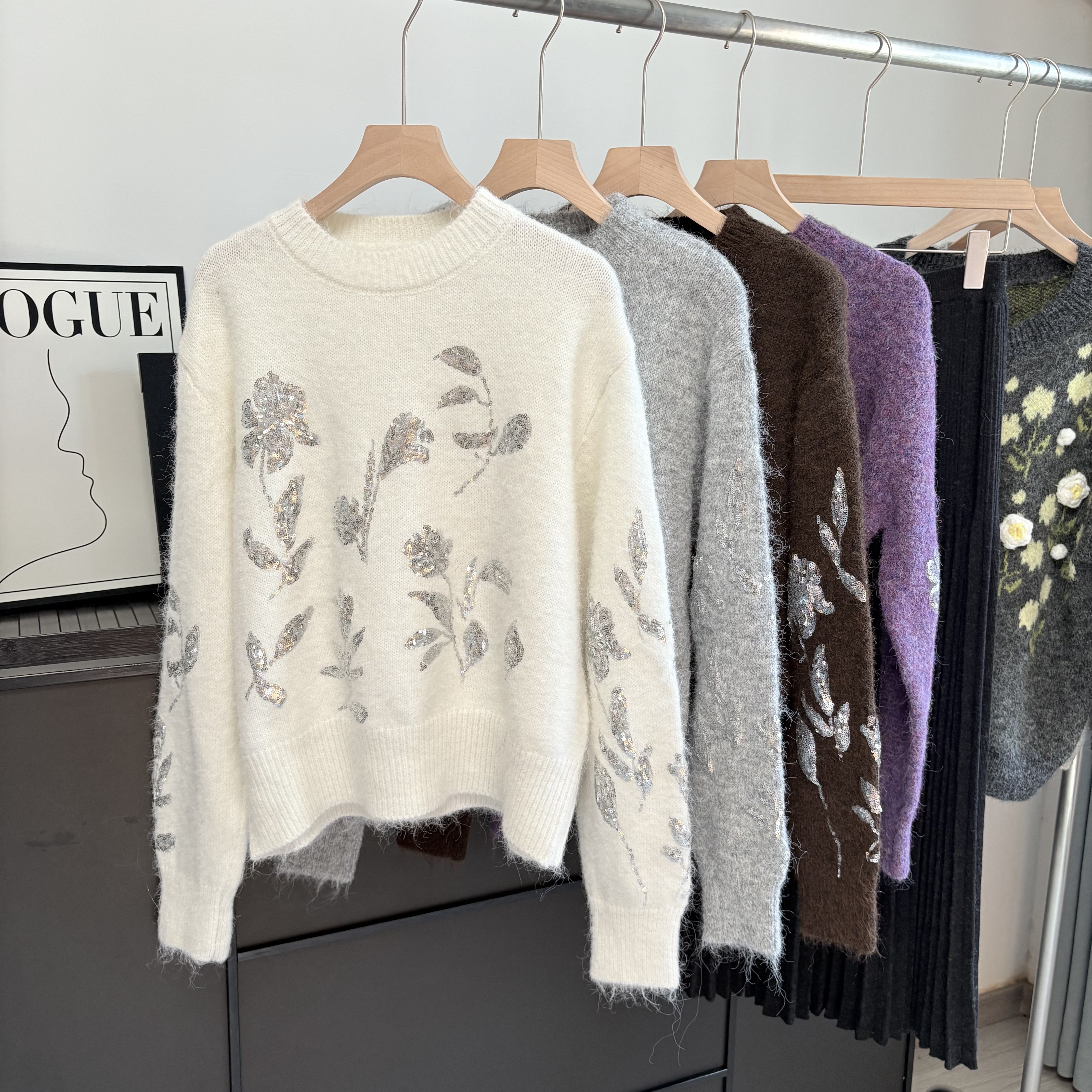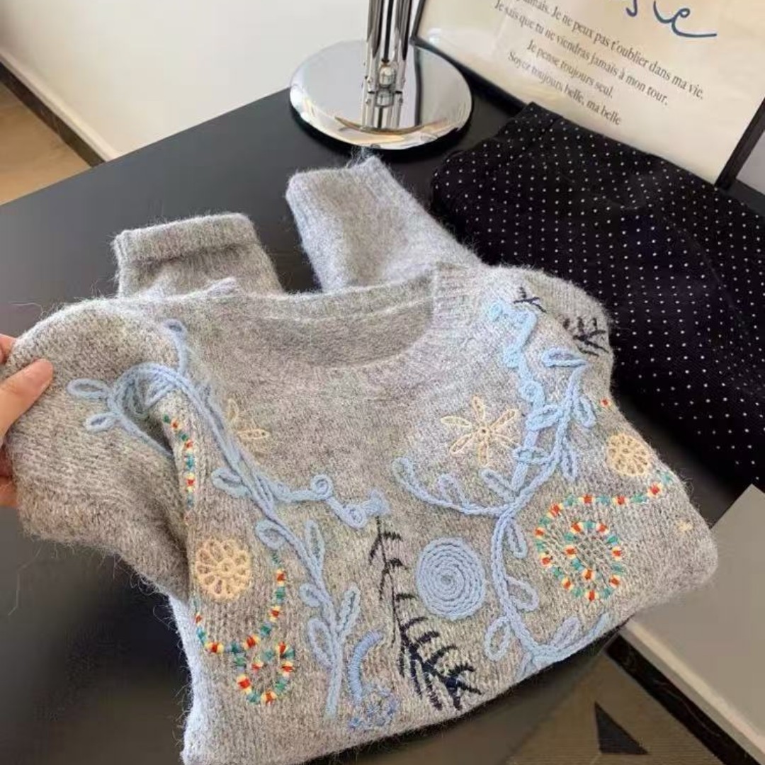 慕兔温柔风花朵刺绣毛衣女2025冬季新款软糯慵懒风宽松针织衫上衣