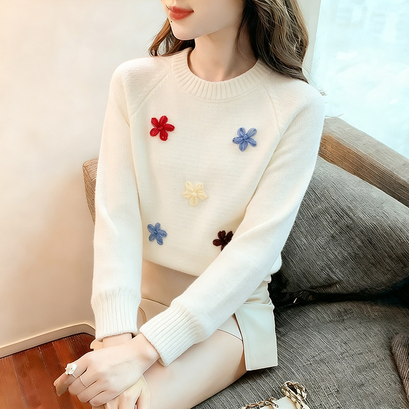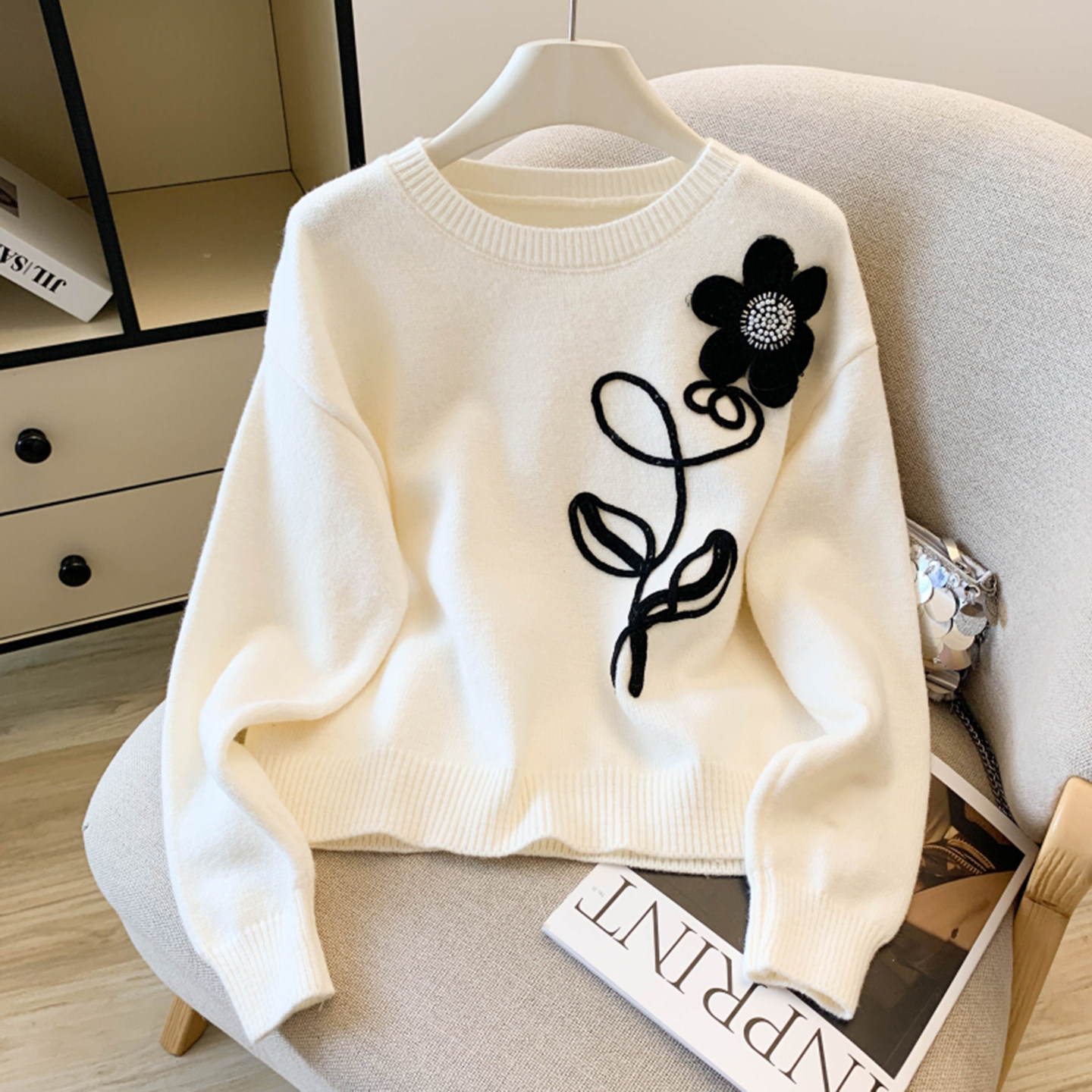韩系甜美立体花朵刺绣毛衣女秋冬新款软糯圆领宽松百搭针织衫上衣