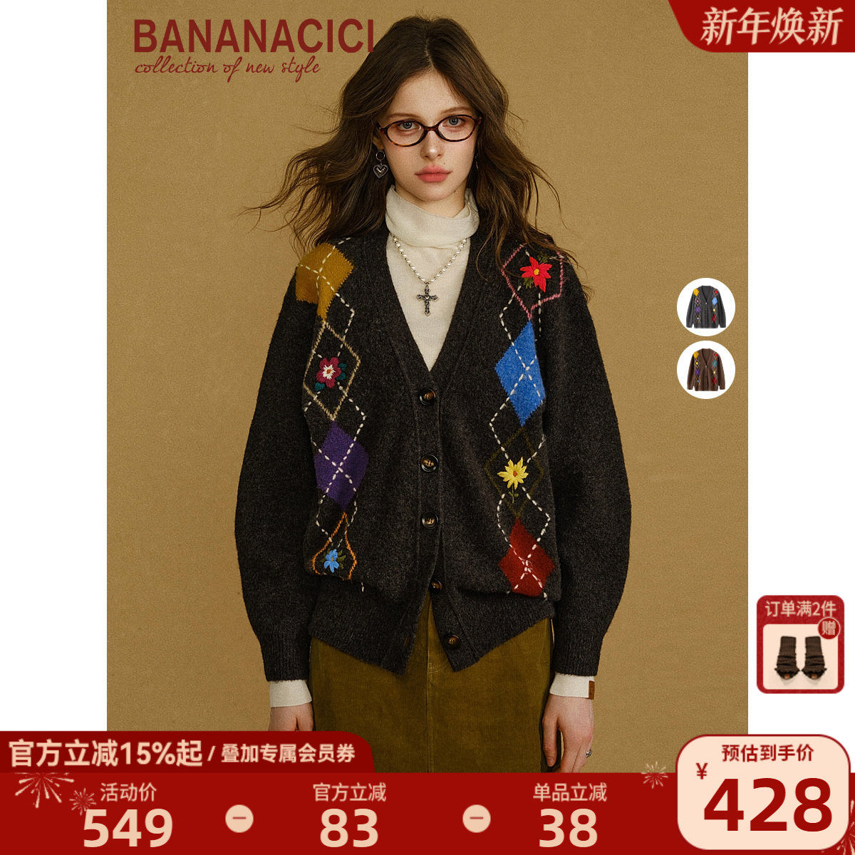 BANANA CICI2025年冬季新款复古菱格纹手工花朵刺绣毛衣针织开衫