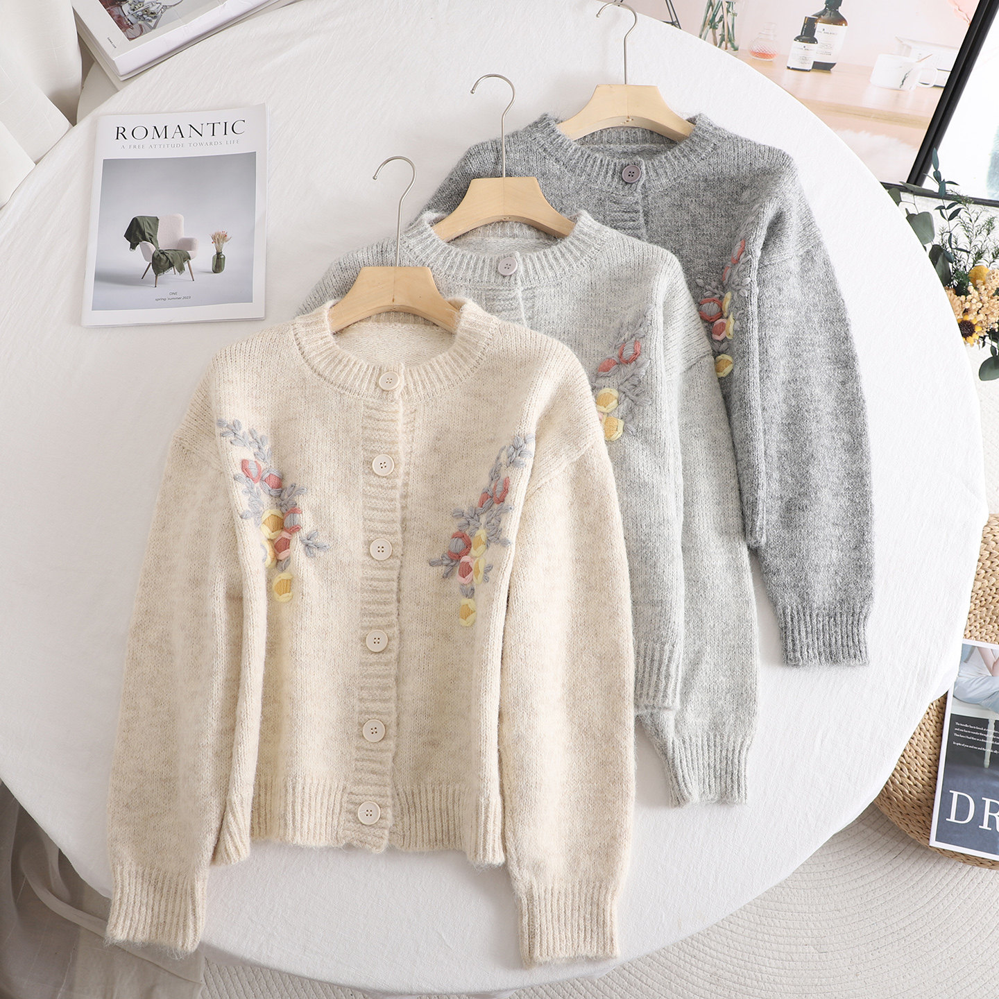 慕兔复古小个子花朵刺绣毛衣女2025冬季新款宽松长袖针织开衫上衣