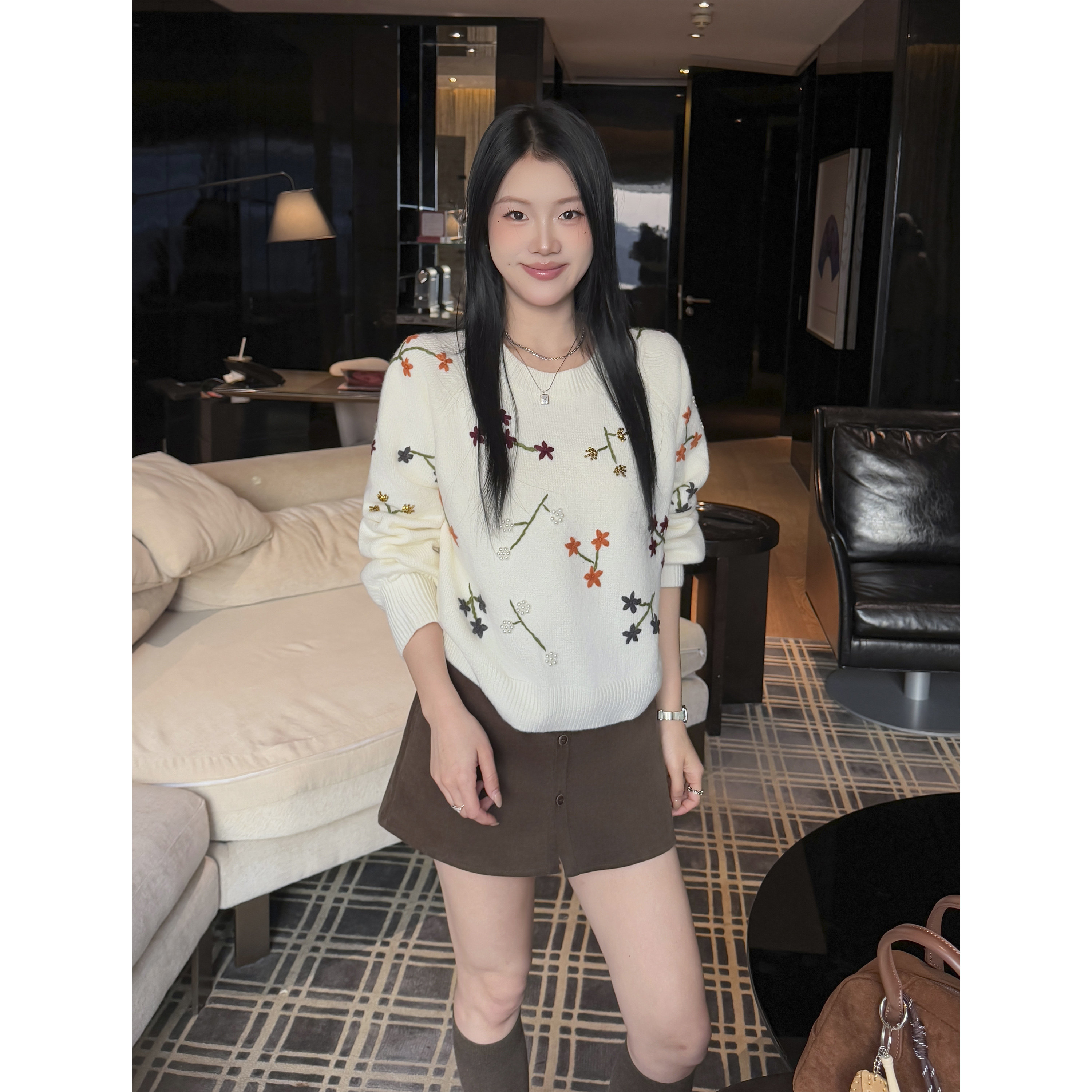 慕兔温柔风花朵刺绣毛衣女2025冬季新款小个子宽松长袖针织衫上衣