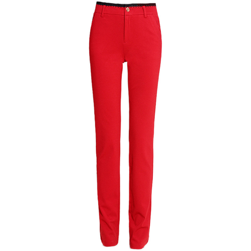 春季红色女裤高腰直筒裤小脚弹力修身休闲中国红中年长裤红裤大红
