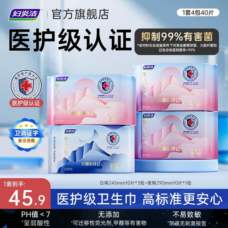 【医护级】妇炎洁卫生巾敏感肌适用抑菌轻薄透气姨妈巾日夜组合装