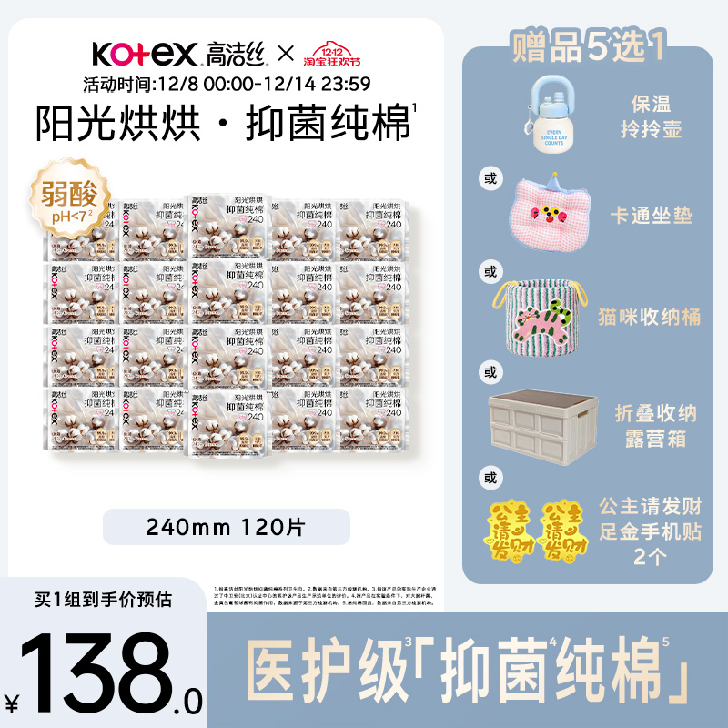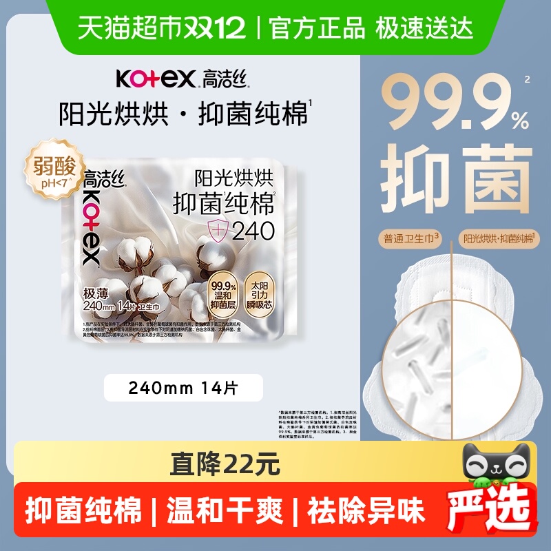 【100%优于新国标】高洁丝阳光烘烘抑菌纯棉卫生巾姨妈巾超薄防漏
