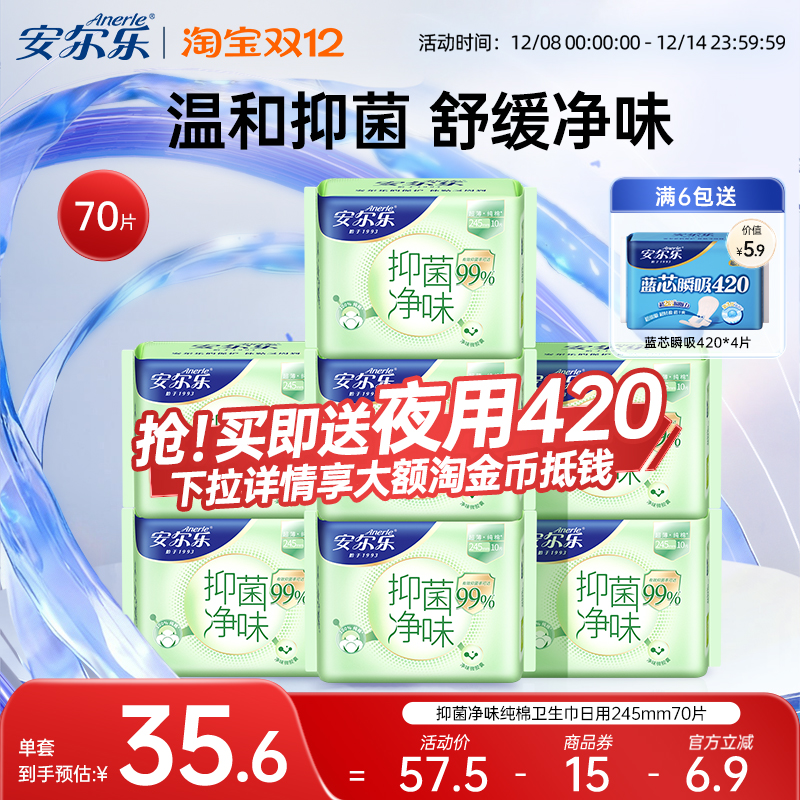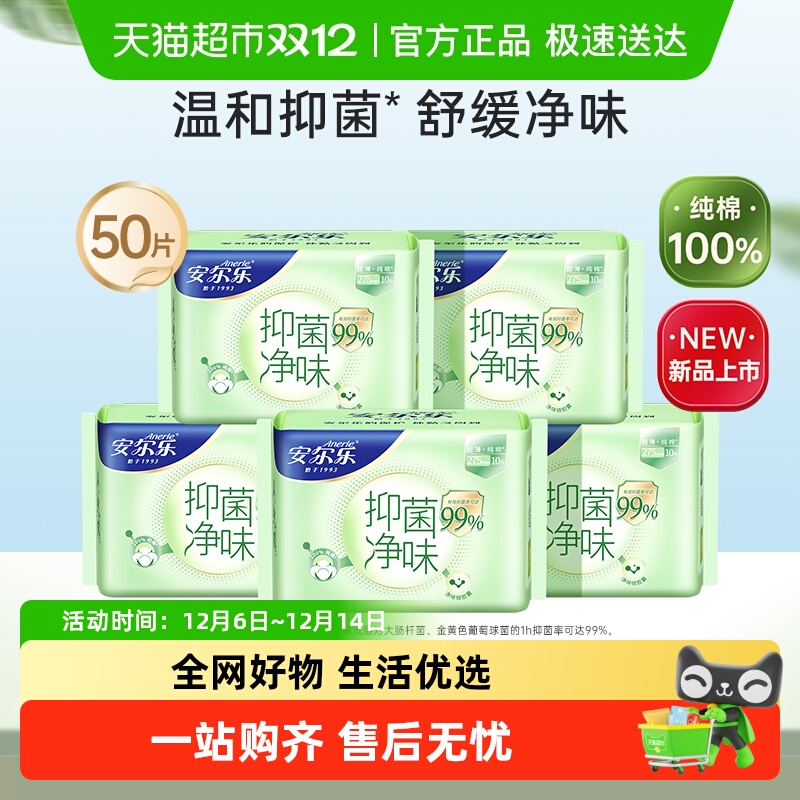 安尔乐新国标卫生巾纯棉抑菌99%净味日用官方正品国货女姨妈巾