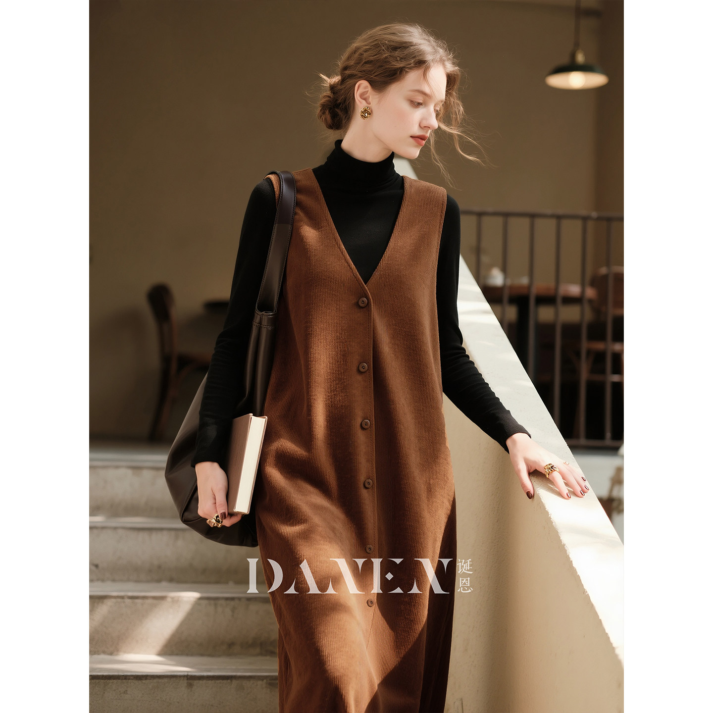 焦糖色V领灯芯绒背带连衣裙女2025年秋冬新款美拉德风叠穿长裙