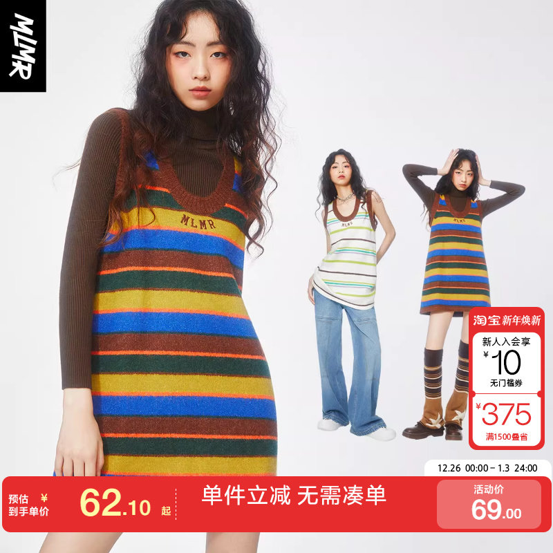 绫致MLMR秋冬装多巴胺穿搭女装长裙背带裙针织撞色条纹连衣裙