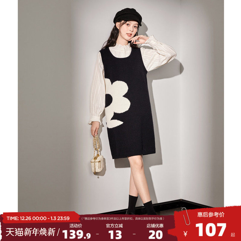 唐狮黑色背心裙女小个子入秋连衣裙秋冬季背带裙花朵毛衣马甲裙t5
