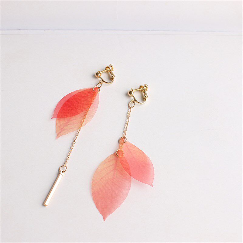 韩版耳环长款韩国气质叶子吊坠静美秋叶耳坠螺丝耳夹无耳洞耳钉女