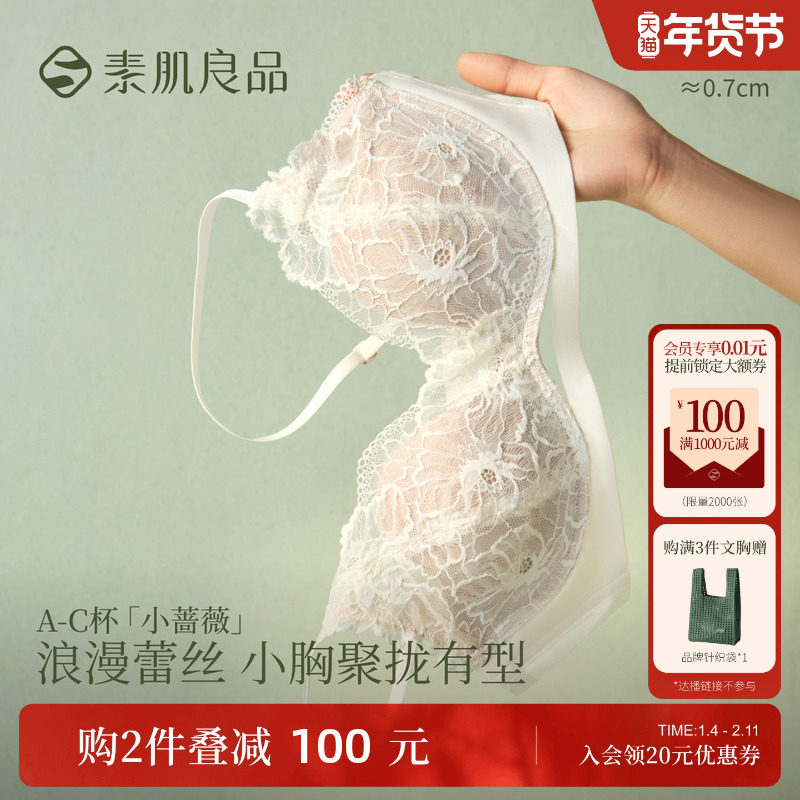 素肌良品小蔷薇无钢圈薄款透气内衣女蕾丝套装性感小胸聚拢文胸罩