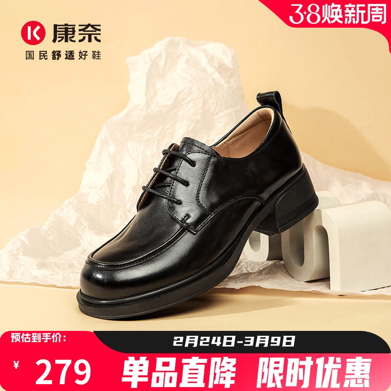 康奈真皮厚底乐福鞋2024春季新款系带休闲女单鞋百搭学院风小皮鞋