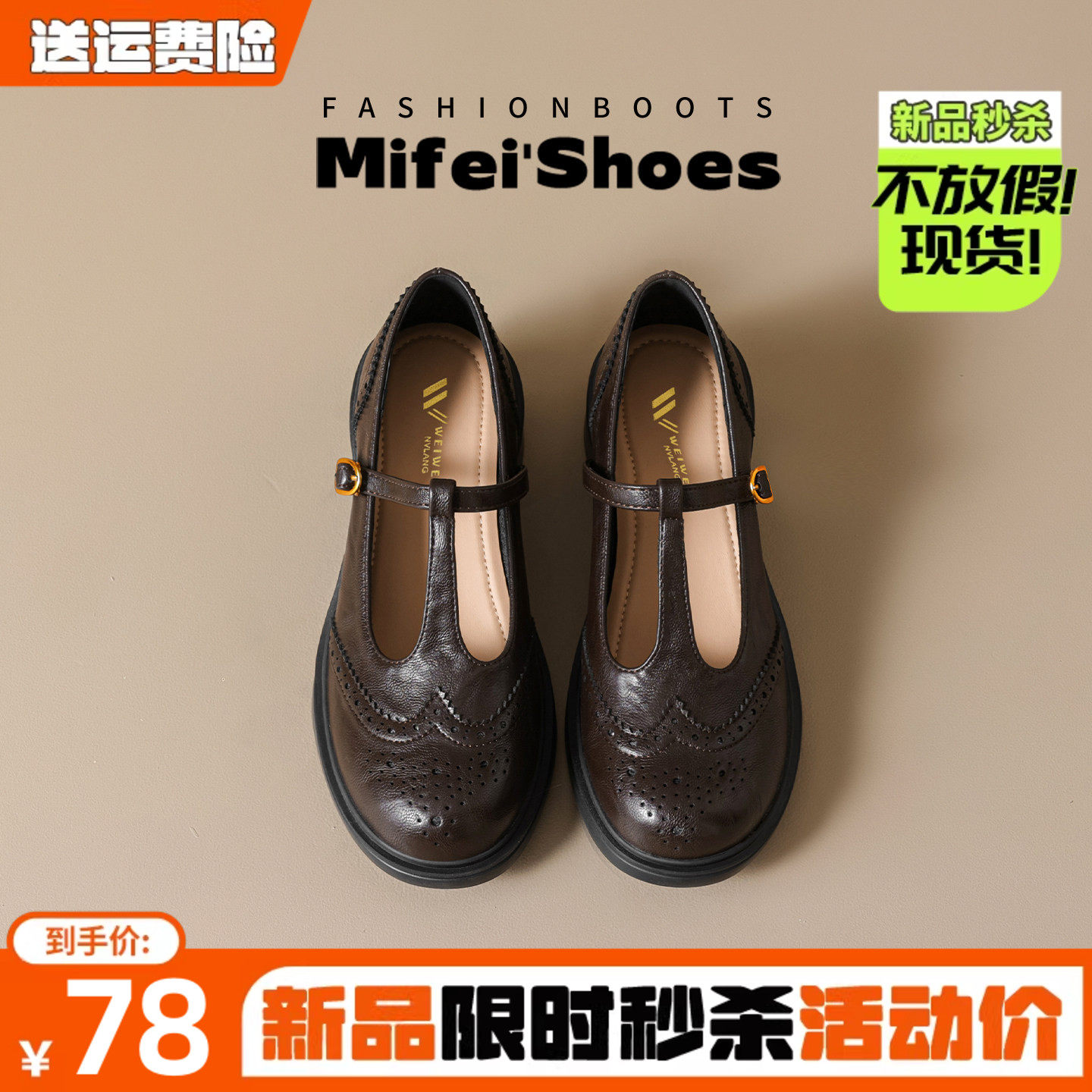羊皮~厚底粗跟学院风小皮鞋女2026新款布洛克雕花圆头玛丽珍单鞋