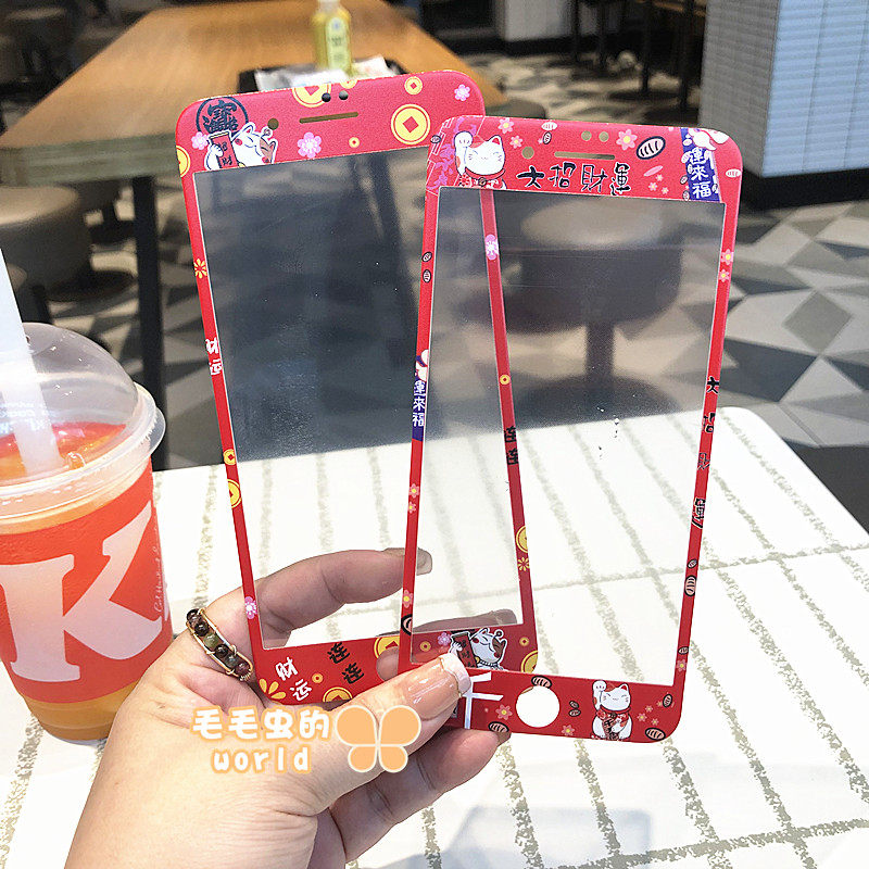 财运连连招财猫适用苹果6s/7/8卡通红色钢化玻璃贴膜新款iPhone6/7/8plus全屏手机彩膜新年红大招财运SE2/3