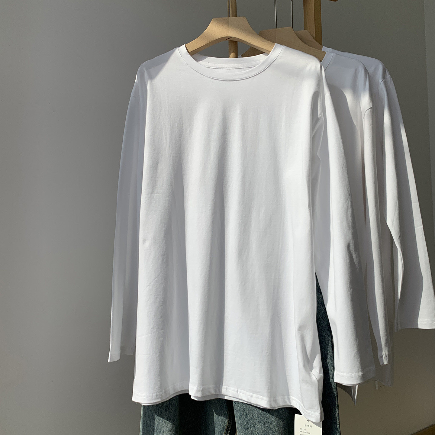 纯棉长袖T恤女21春夏季学生韩版宽松纯色打底衫上衣中长款百搭