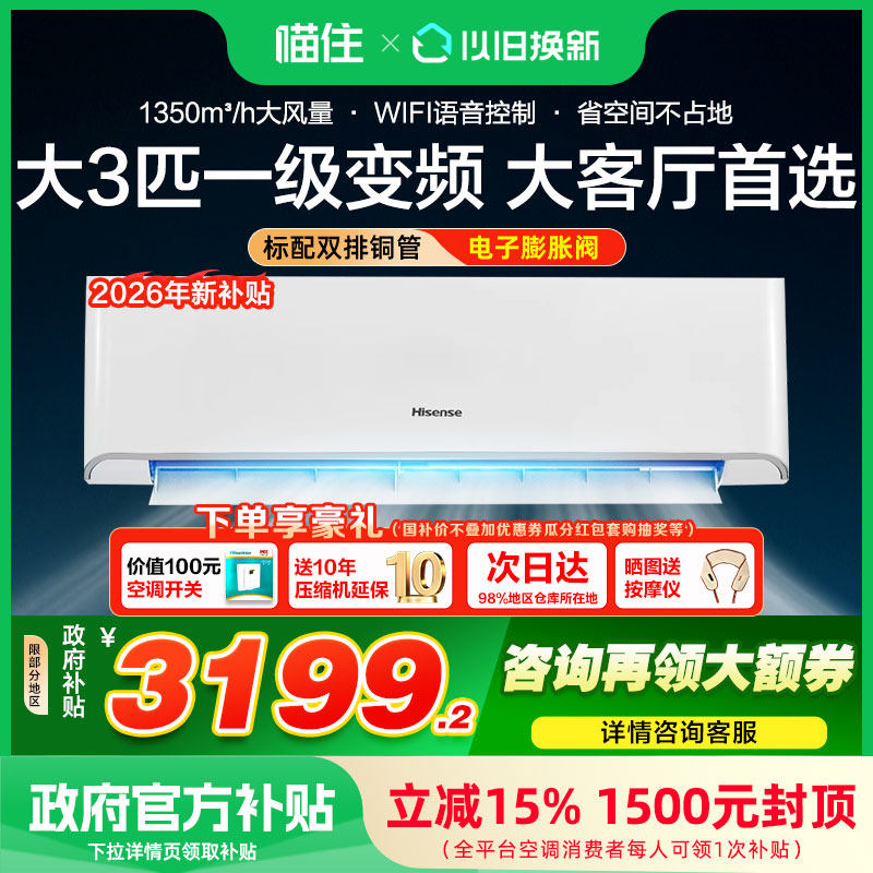 国家补贴海信大3匹空调挂机一级变频冷暖家用客厅壁挂式空调603