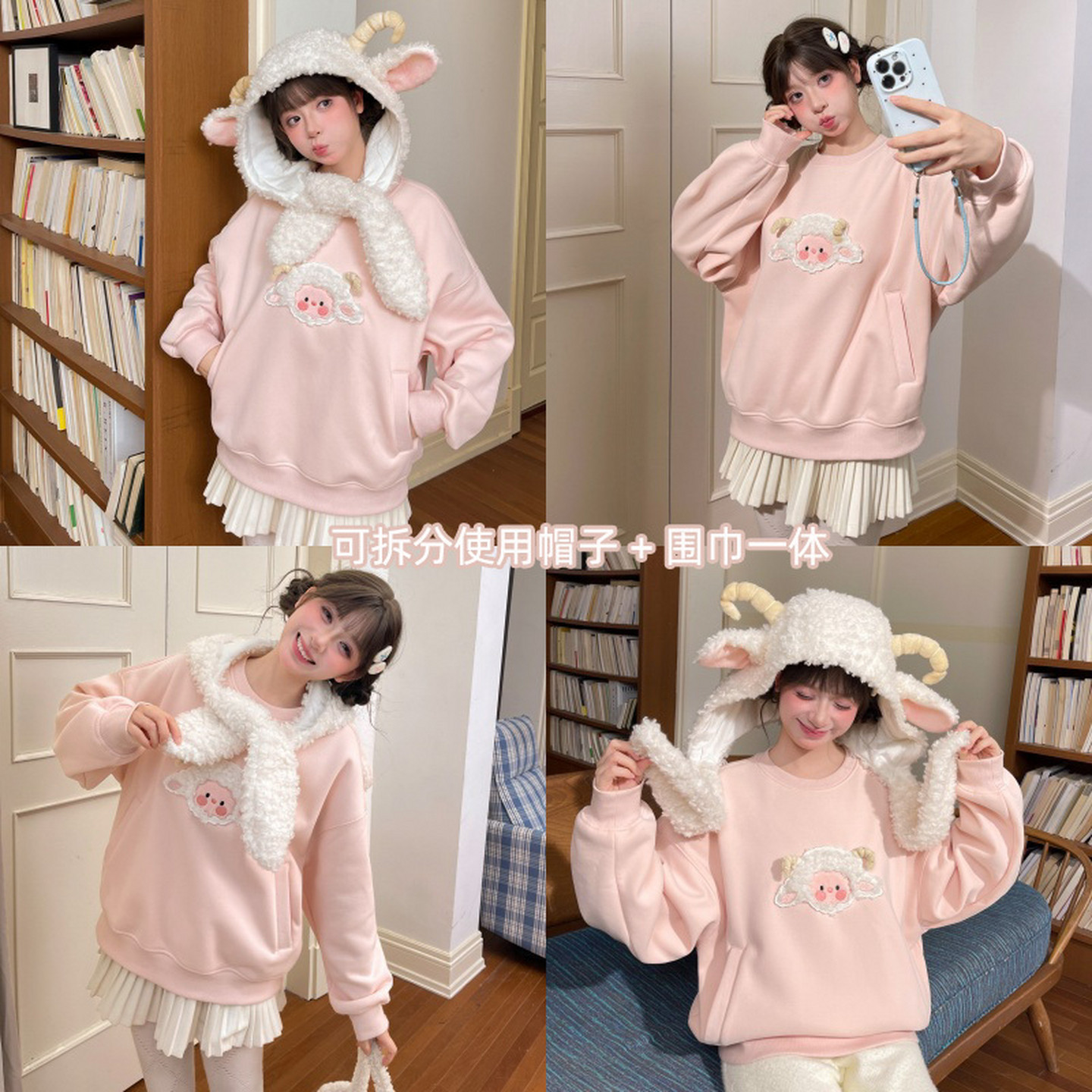 森女部落甜美风设计感毛绒帽小羊刺绣加绒卫衣女新款宽松上衣冬季