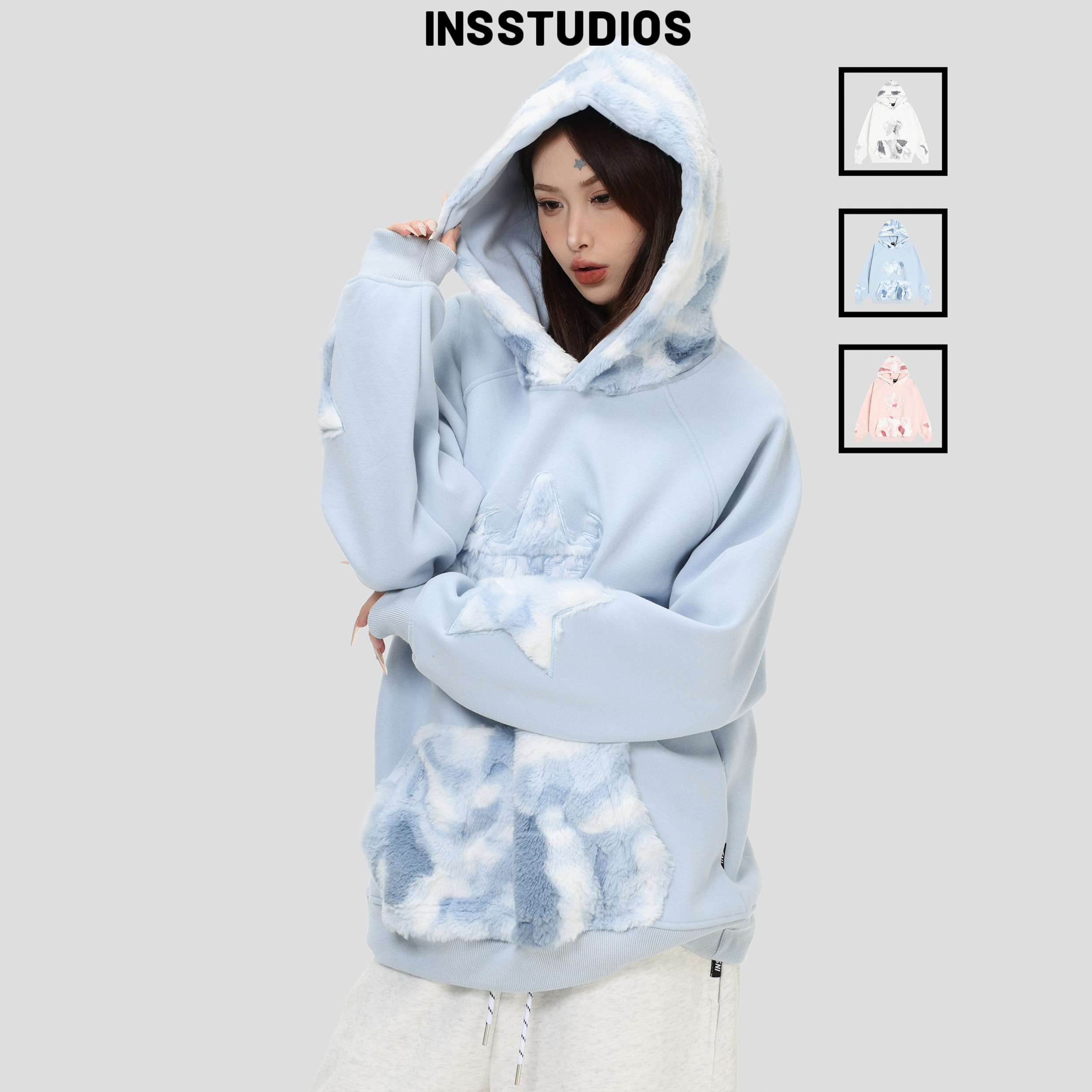 INSstudios 国潮美式复古「毛绒星星贴布连帽卫衣」宽松加绒帽衫