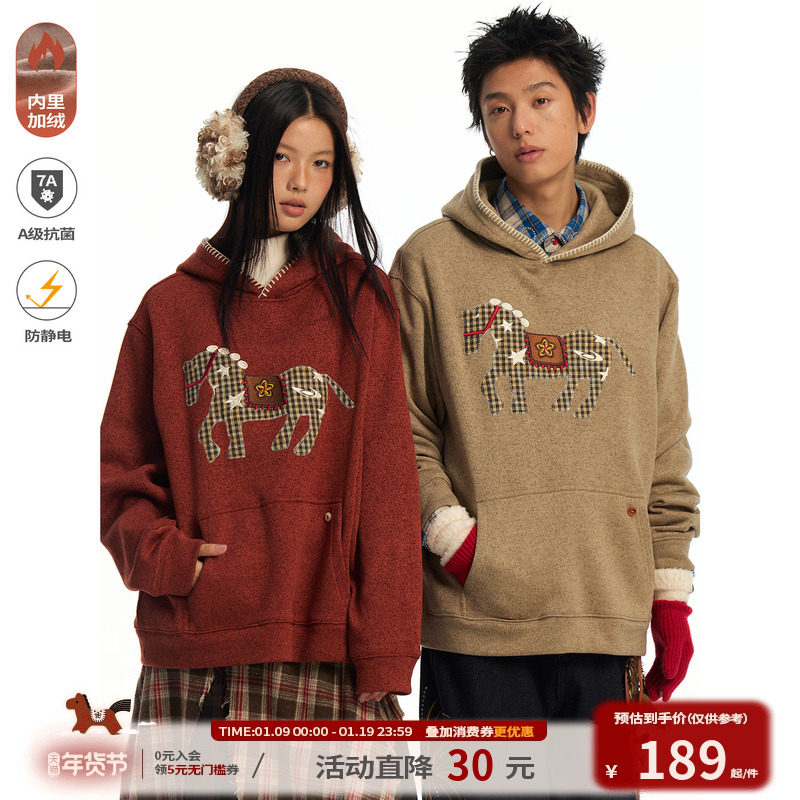 江南先生NewJNXS"马上有"毛绒小马贴布绣宽松连帽慵懒新年卫衣冬