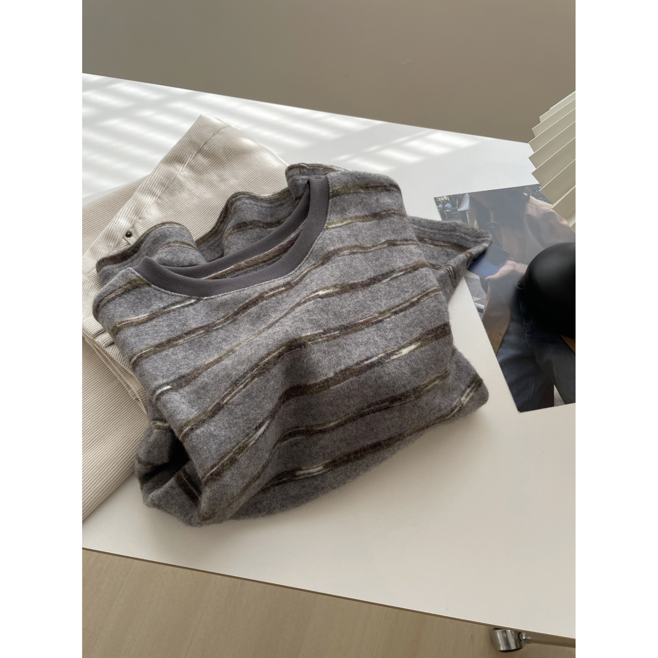 韩系软糯兔毛绒条纹长袖卫衣女!秋冬慵懒宽松显瘦撞色圆领打底衫