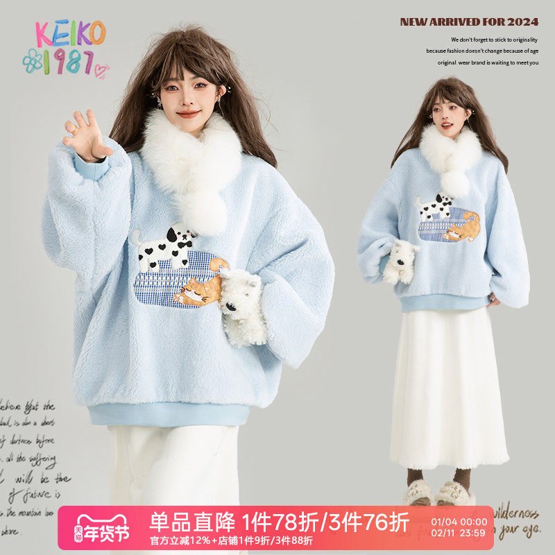 KEIKO[萌宠贴布绣] baby蓝软糯羊羔毛绒卫衣25冬季温柔感宽松外套
