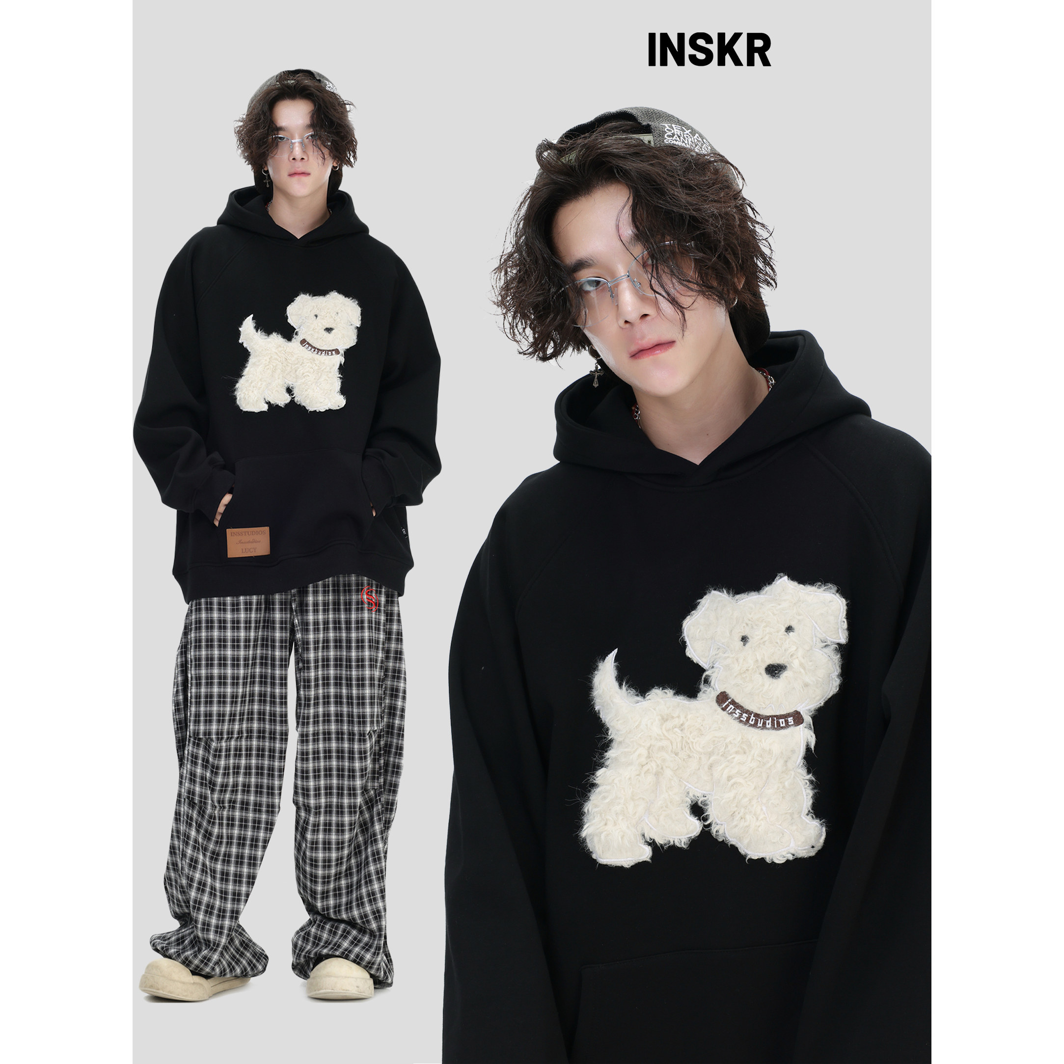 【INSKR】国潮牌情侣美式「毛绒狗狗刺绣卫衣」宽松加绒连帽衫男
