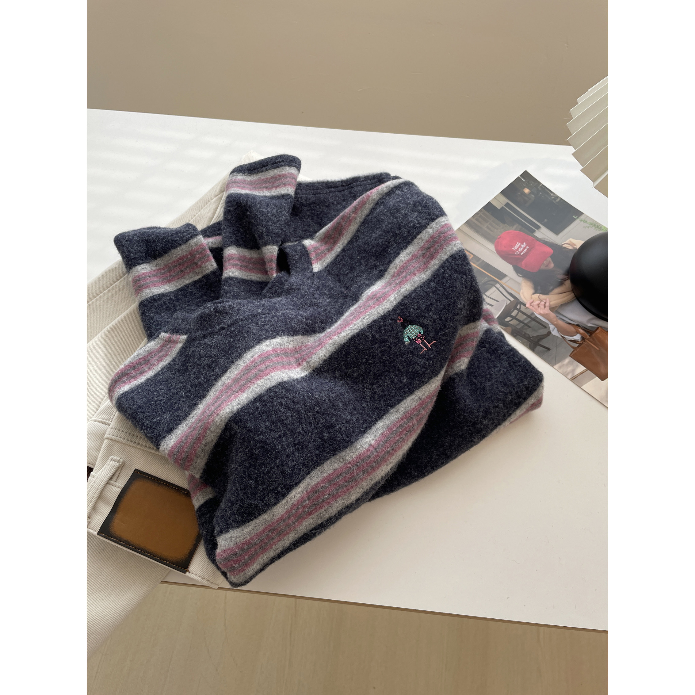 小刺绣~软糯毛绒绒撞色条纹卫衣女!慵懒宽松中长圆领长袖打底衫