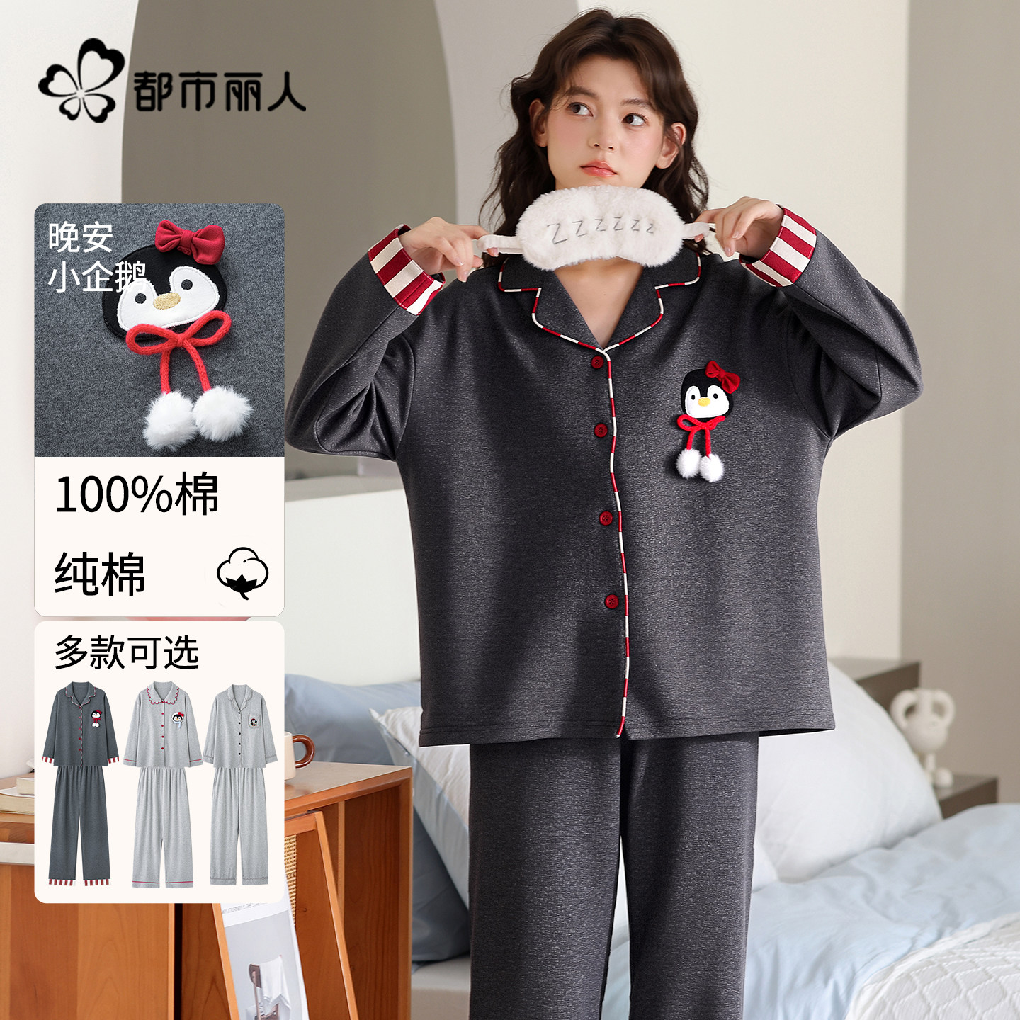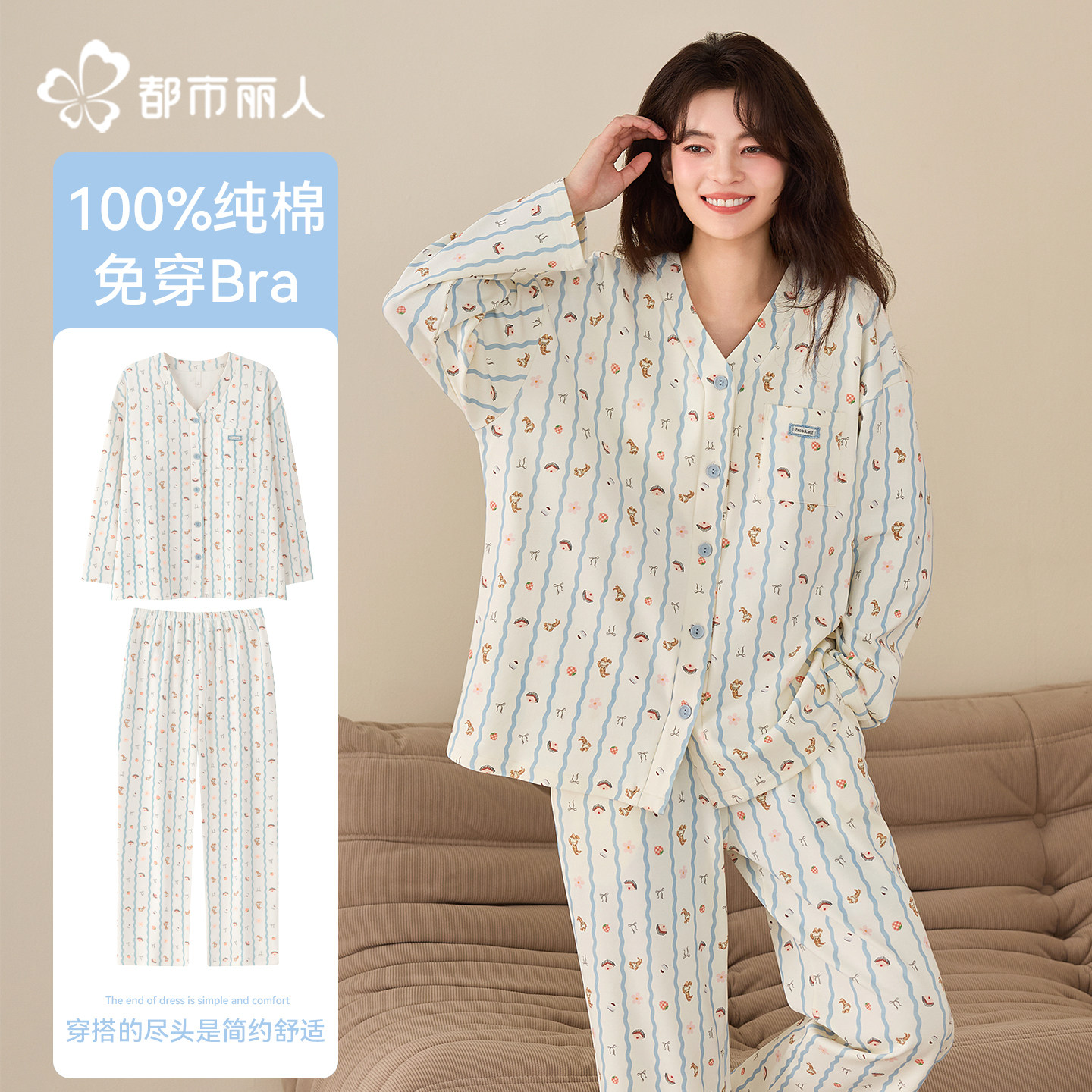 都市丽人【轻柔软】春秋季纯棉睡衣女甜美可爱开衫长袖家居服套装