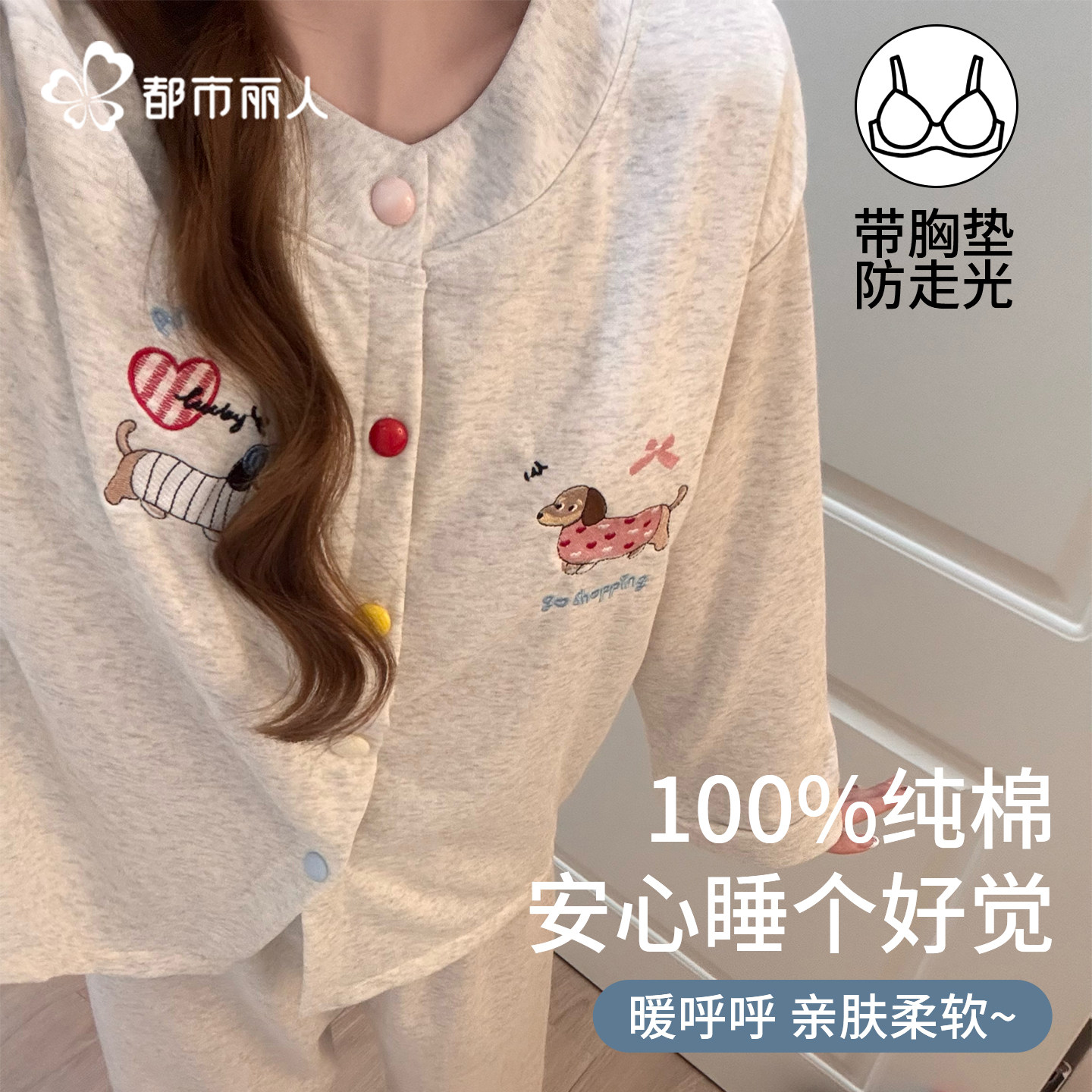 都市丽人带胸垫睡衣女100%纯棉春秋季甜美可爱长袖家居服女可外穿