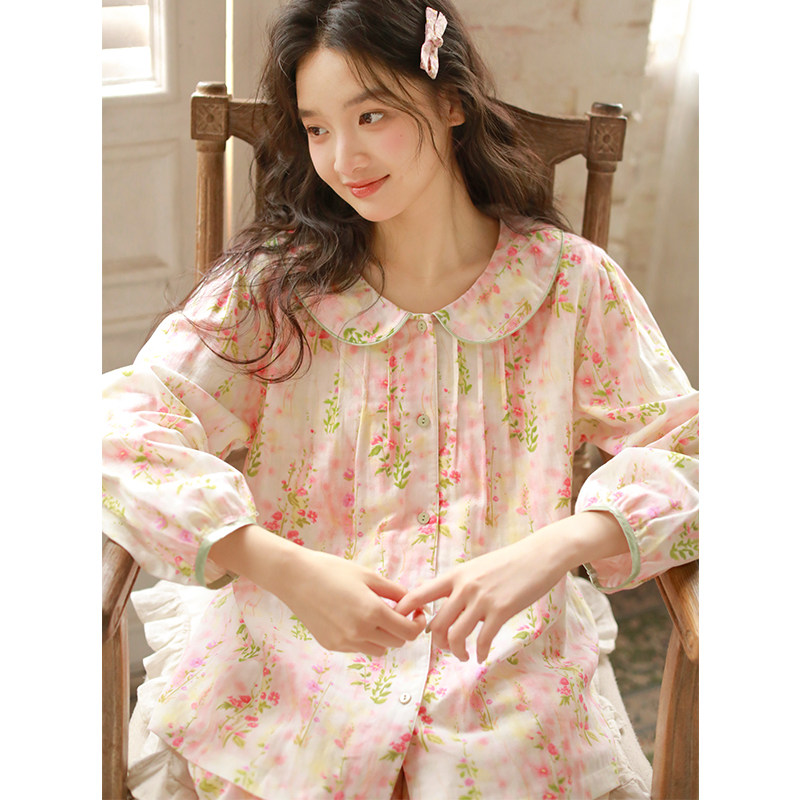 2026新款甜美可爱纯棉睡衣女春秋娃娃领全棉纱布长袖家居服套装