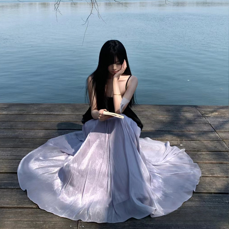 海岛缎面大裙摆波光粼粼半身裙女春夏2025年新款高腰显瘦a字长裙