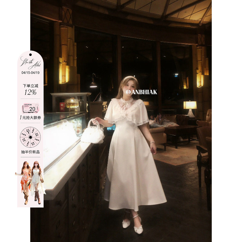 安妮不火木梨花缎带结甜美系斗篷千金裙女夏季新款微胖大码公主裙