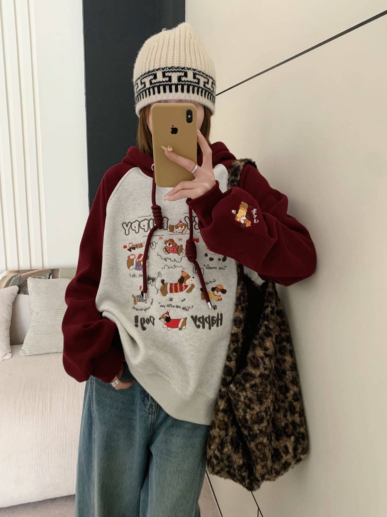 5035加绒加厚腊肠狗宽松插肩袖长袖连帽卫衣女韩版宽松百搭休闲潮