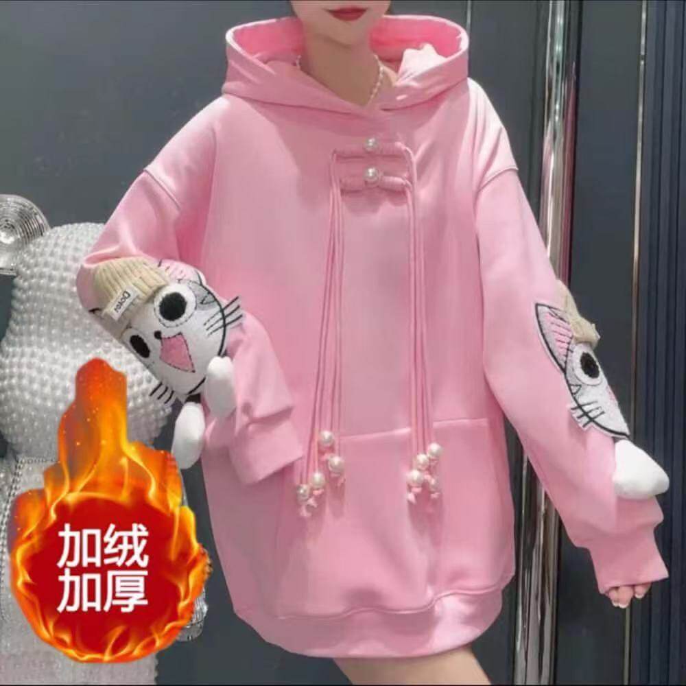 秋冬装新款猫咪刺绣加绒加厚连帽卫衣女韩版宽松大码洋气休闲外套