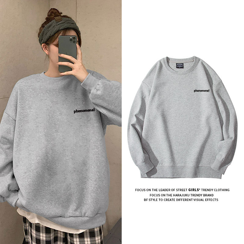 简约胸标字母灰色早秋薄款卫衣女韩版宽松美式复古圆领早秋上衣潮