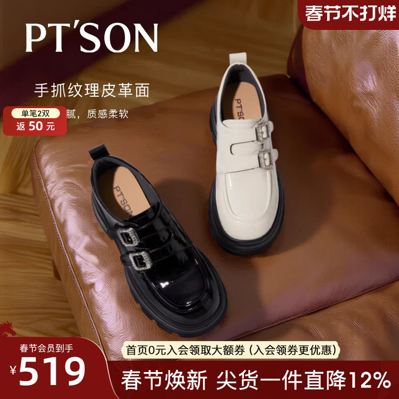 商场同款百田森厚底乐福鞋女2026春季新款黑色皮鞋水钻学院风单鞋